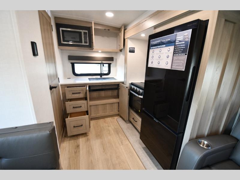 The Flagstaff Micro Lite 25FBD travel trailer delivers big comfort in a lightweight, easy-to-tow package. A front 60" x 74" queen bed with flip-up storage keeps your sleeping space organized, while a large slide-out houses the theater seat, three-burner cooktop, and refrigerator for a functional, open living area. A second slide-out includes a pantry and wardrobe for extra storage. Dine at the booth dinette or take your meals outdoors under the 20' power awning, and enjoy the full bathroom so you can refresh anytime without leaving your trailer.
