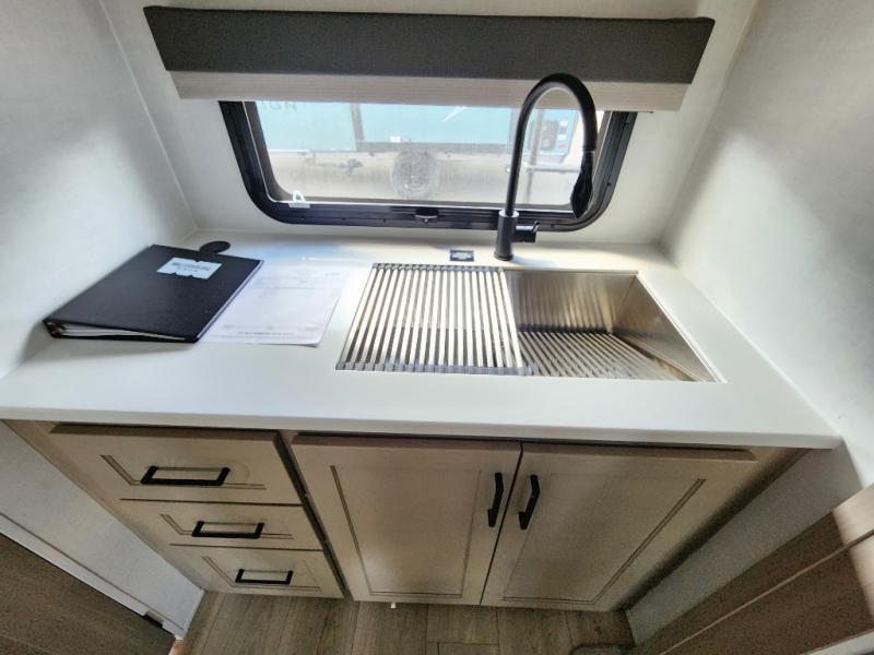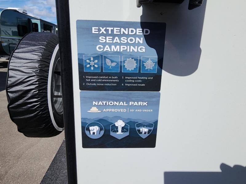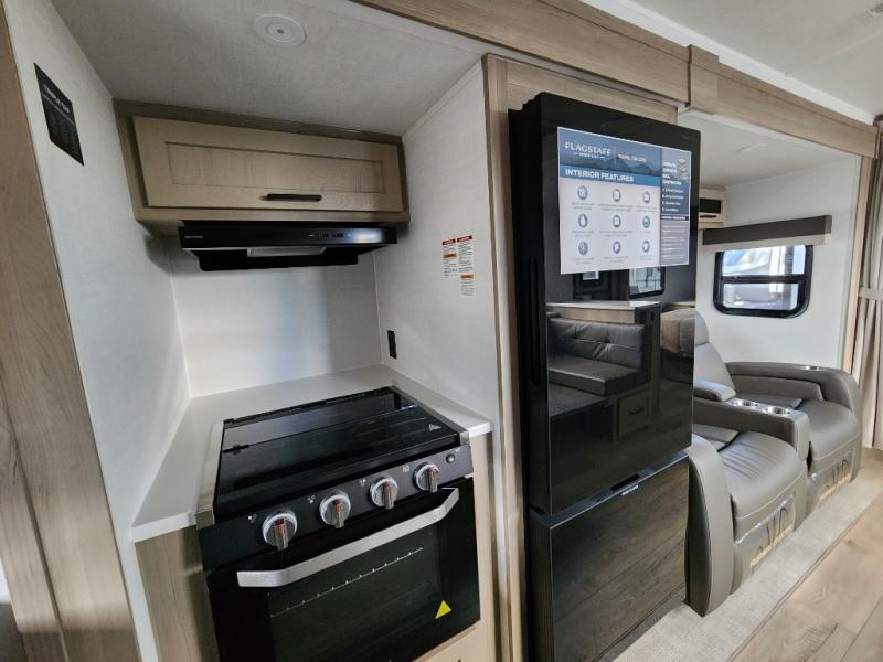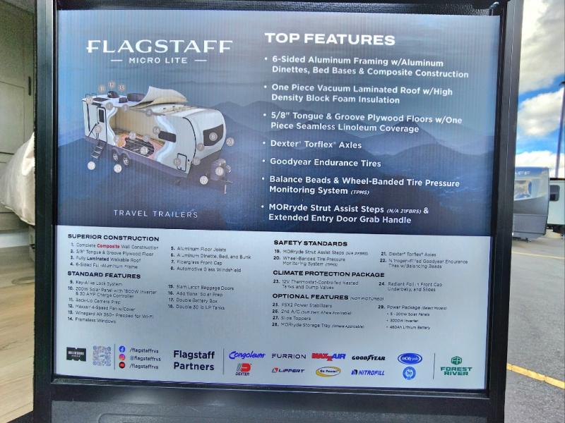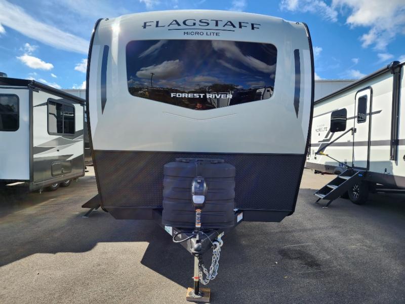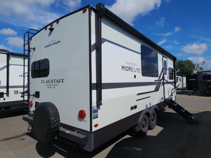 With any Flagstaff Micro Lite travel trailer by Forest River you will enjoy lightweight towing, durable construction, and added interior comforts to make each trip memorable! Each model features RoadTech tire pressure monitoring, Dexter Torflex axles, and nitrogen-filled Goodyear endurance tires for smooth towing from home to campground. The 6-sided aluminum framed construction provides a strong foundation so you can enjoy your RV for years to come, plus the radiant foil in the front cap, underbelly and slides help insulate your trailer. Additional exterior features include a 200W solar panel, back-up camera prep, frameless windows, and slam baggage doors. Each model includes the Great Expectations Package with roller shades, solid surface kitchen countertops, and hidden hinge cabinet doors. There is also an exterior hot/cold water port, outside speakers, a power tongue jack and stabilizer jacks, plus many more conveniences.