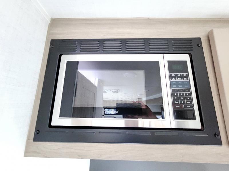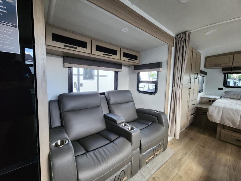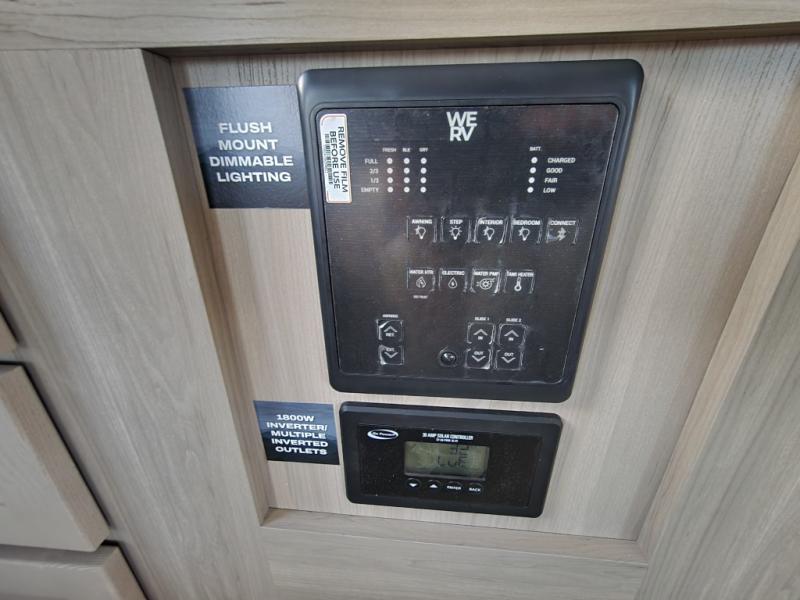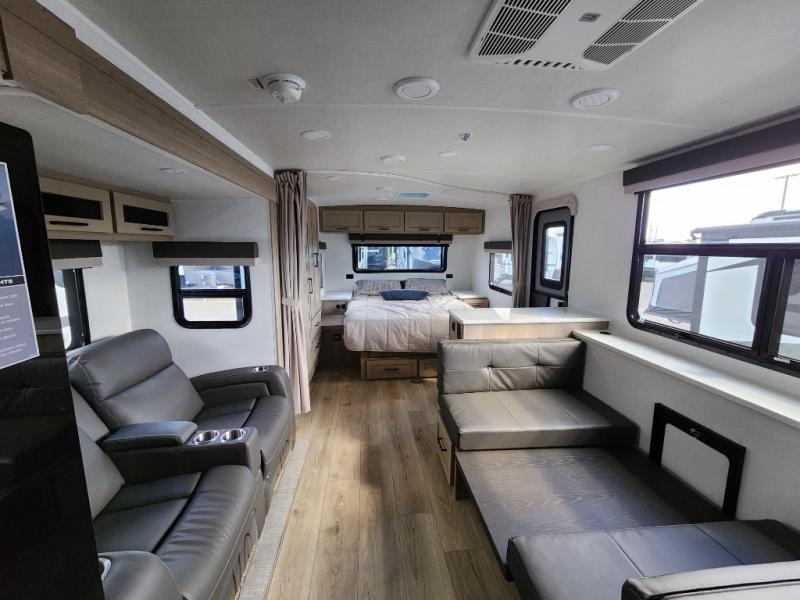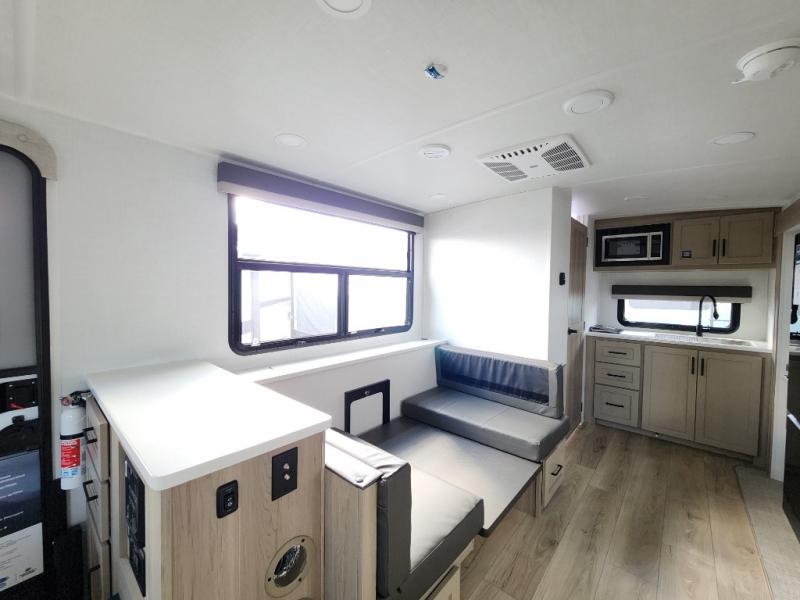 You'll be met with comfort at every turn in this spacious travel trailer. There is a large slide out which houses the theater seat, cooktop and refrigerator, plus a second slide out with a pantry/wardrobe for extra storage. You can sleep great each night on the front 60" x 74" queen bed, and there is flip-up storage underneath for extra blankets, boards games, and more. Once dinner has been made, you can dine at the booth dinette, or take your plate outdoors to relax under the 20' power awning. This unit also includes a full bath so you don't have to use the camp's facilities in the middle of the night!