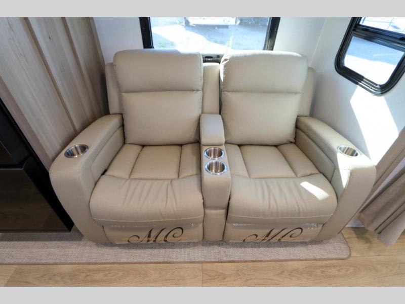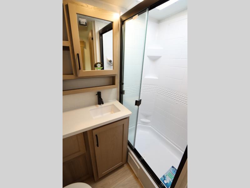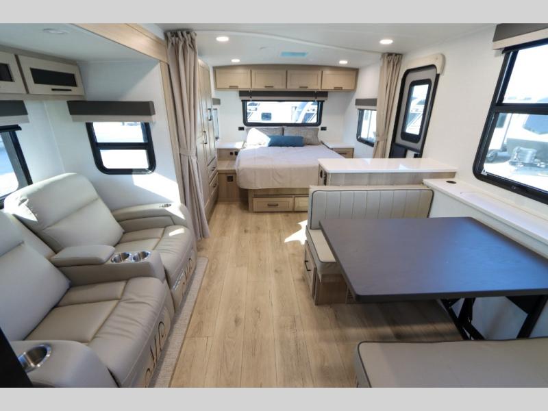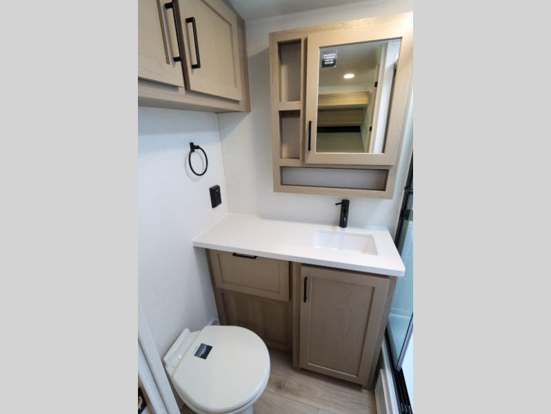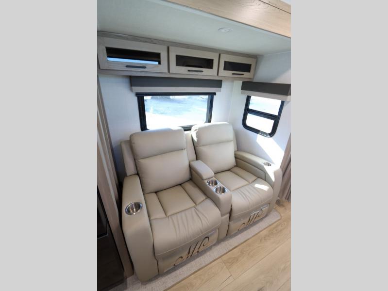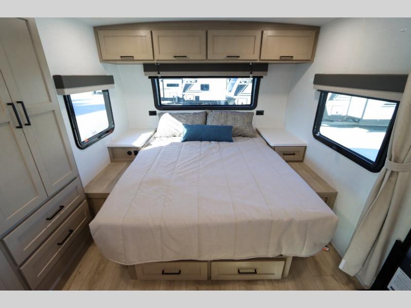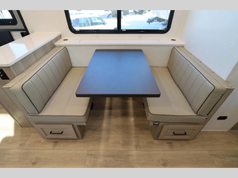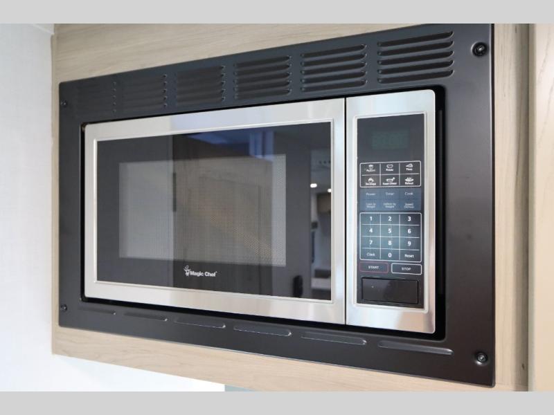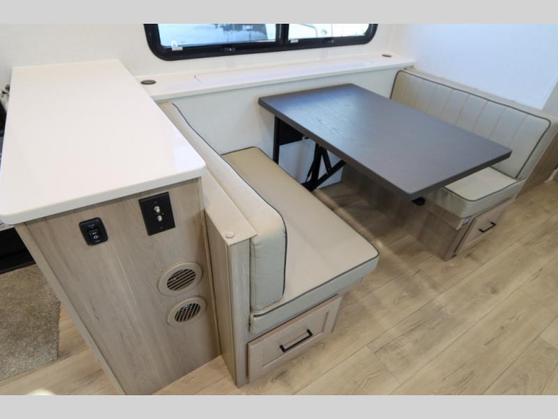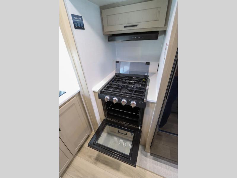 If you like to camp with your honey or a friend, this travel trailer will be perfect for you! You can sleep two people each night on the RV queen bed in the front private bedroom. You'll also find a wardrobe slide in the bedroom for more space, plus an additional wardrobe and an optional TV if you enjoy movies in bed. The theater seat with tables will provide a place to relax and dine together, and if you do need extra sleeping space, just choose the optional hide-a-bed sofa with a table instead of the theater seat. Delicious meals can be made on the three burner cooktop or in the 21" gas oven, and there is a 12V refrigerator for leftovers. The exterior is just as accommodating as the interior with its exterior griddle, drop-frame pass-through storage, 2" receiver hitch, and 20' power awning with LED lights.