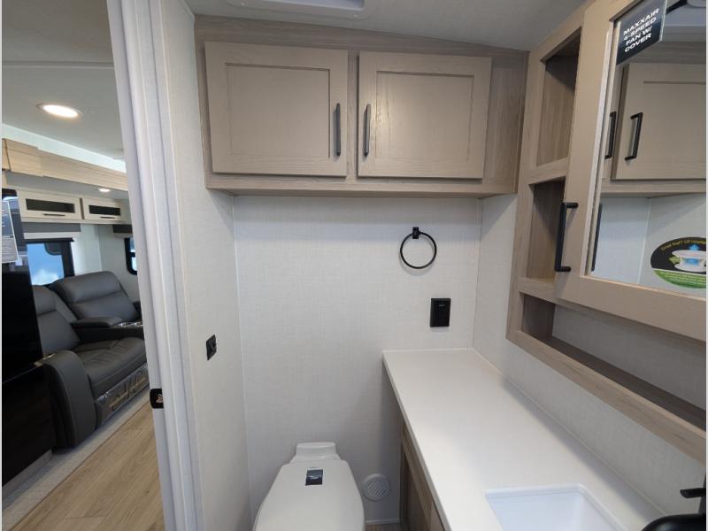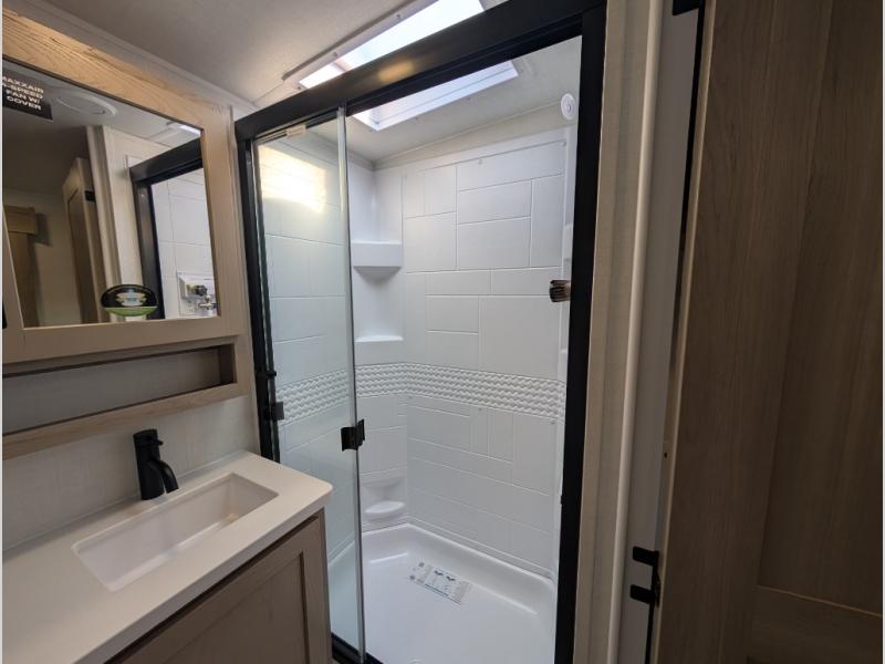 You'll be met with comfort at every turn in this spacious travel trailer. There is a large slide out which houses the theater seat, cooktop and refrigerator, plus a second slide out with a pantry/wardrobe for extra storage. You can sleep great each night on the front 60" x 74" queen bed, and there is flip-up storage underneath for extra blankets, boards games, and more. Once dinner has been made, you can dine at the booth dinette, or take your plate outdoors to relax under the 20' power awning. This unit also includes a full bath so you don't have to use the camp's facilities in the middle of the night!