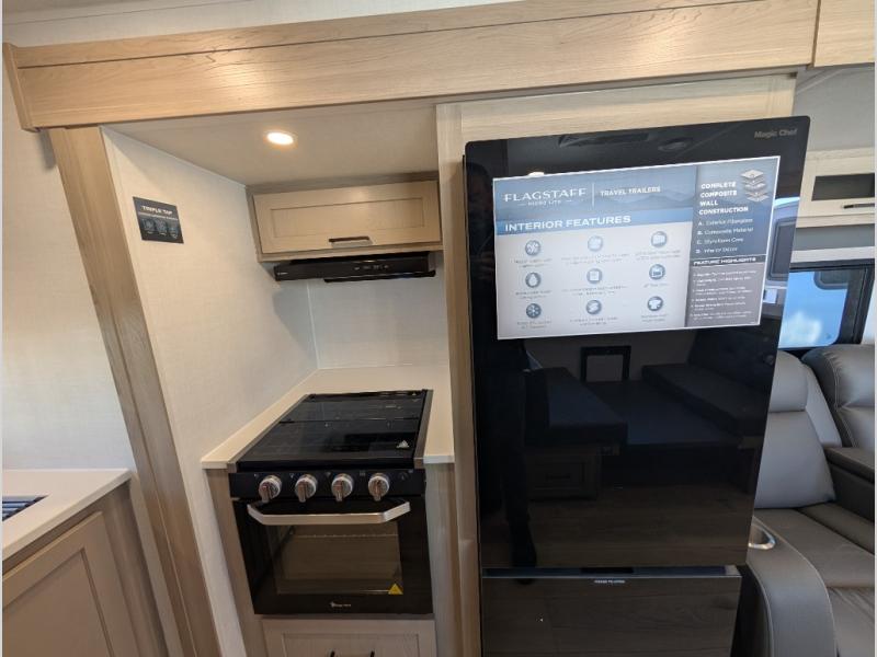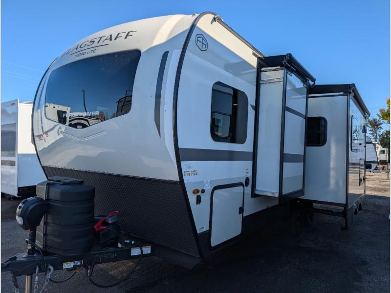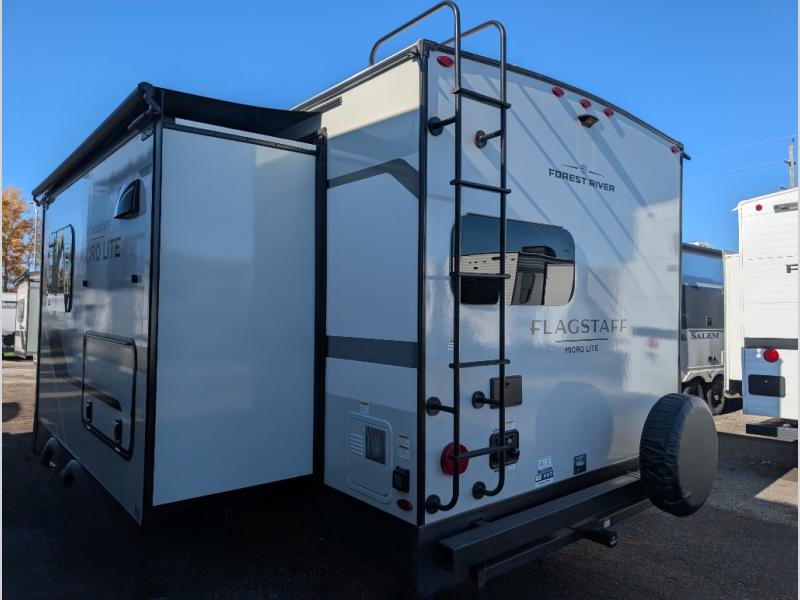 With any Flagstaff Micro Lite travel trailer by Forest River you will enjoy lightweight towing, durable construction, and added interior comforts to make each trip memorable! Each model features RoadTech tire pressure monitoring, Dexter Torflex axles, and nitrogen-filled Goodyear endurance tires for smooth towing from home to campground. The 6-sided aluminum framed construction provides a strong foundation so you can enjoy your RV for years to come, plus the radiant foil in the front cap, underbelly and slides help insulate your trailer. Additional exterior features include a 200W solar panel, back-up camera prep, frameless windows, and slam baggage doors. Each model includes the Great Expectations Package with roller shades, solid surface kitchen countertops, and hidden hinge cabinet doors. There is also an exterior hot/cold water port, outside speakers, a power tongue jack and stabilizer jacks, plus many more conveniences.