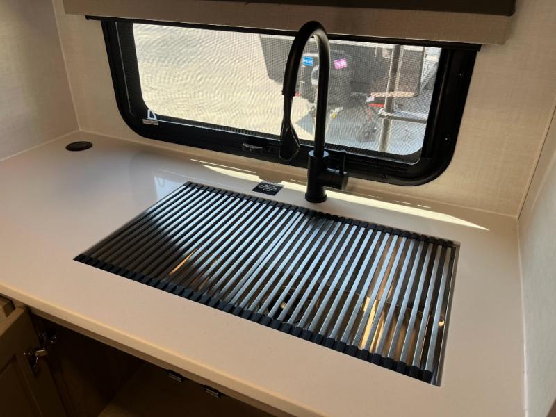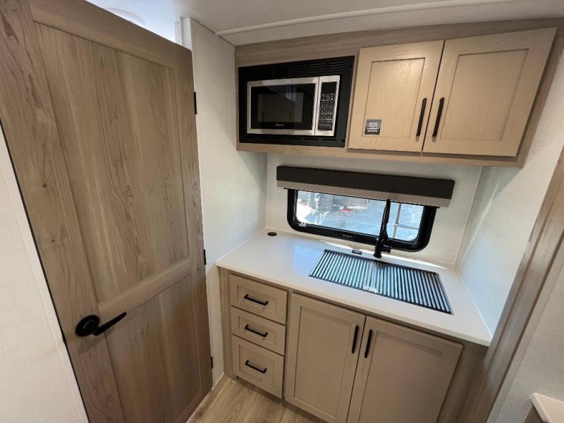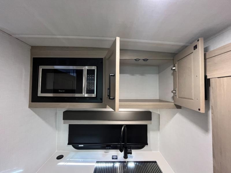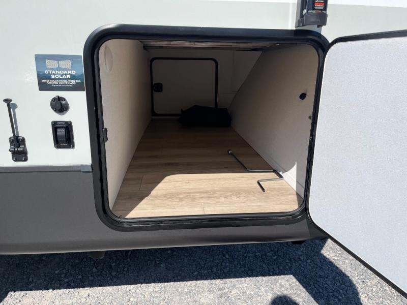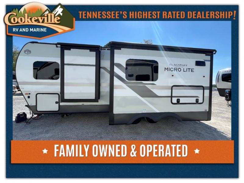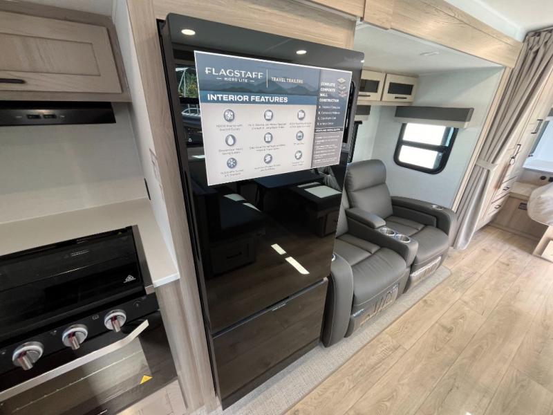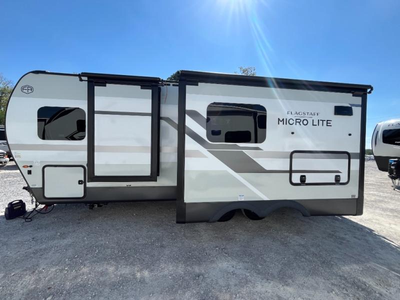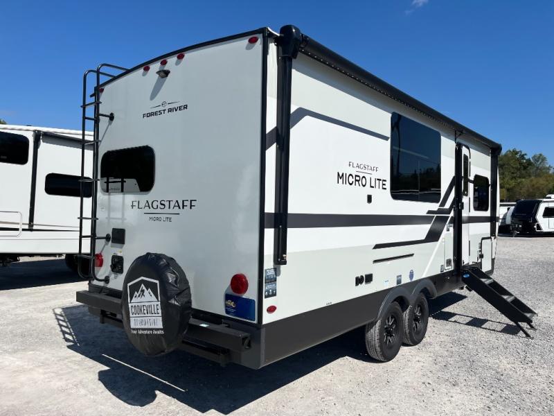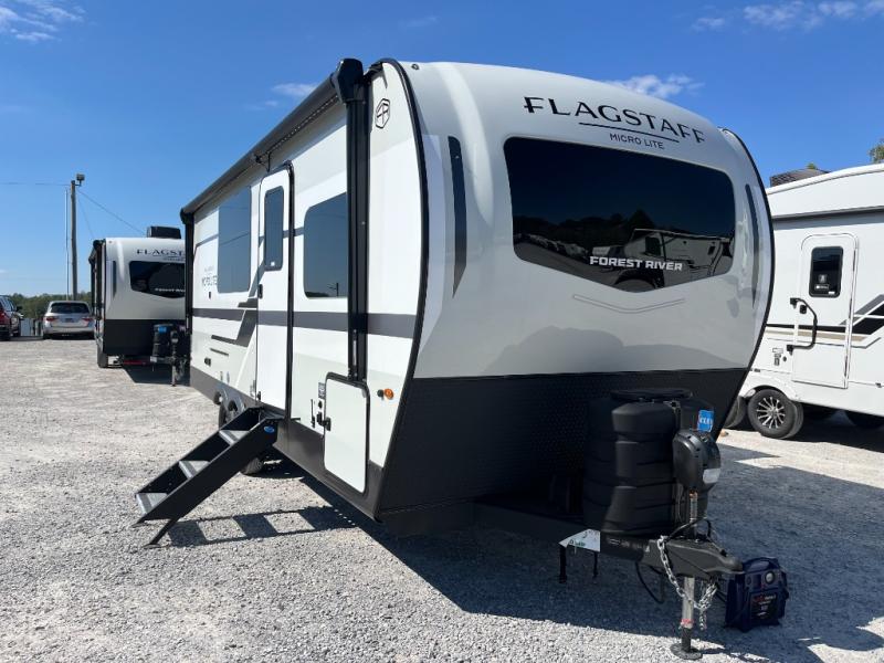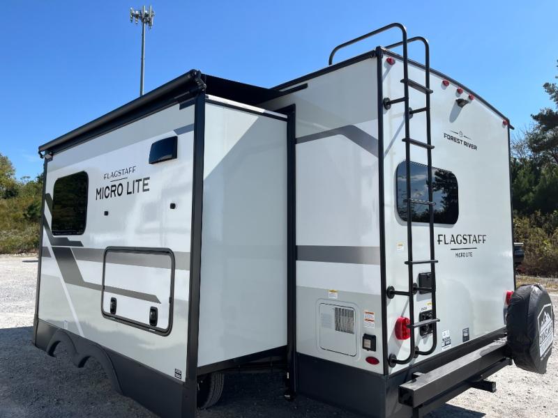 With any Flagstaff Micro Lite travel trailer by Forest River you will enjoy lightweight towing, durable construction, and added interior comforts to make each trip memorable! Each model features RoadTech tire pressure monitoring, Dexter Torflex axles, and nitrogen-filled Goodyear endurance tires for smooth towing from home to campground. The 6-sided aluminum framed construction provides a strong foundation so you can enjoy your RV for years to come, plus the radiant foil in the front cap, underbelly and slides help insulate your trailer. Additional exterior features include a 200W solar panel, back-up camera prep, frameless windows, and slam baggage doors. Each model includes the Great Expectations Package with roller shades, solid surface kitchen countertops, and hidden hinge cabinet doors. There is also an exterior hot/cold water port, outside speakers, a power tongue jack and stabilizer jacks, plus many more conveniences.