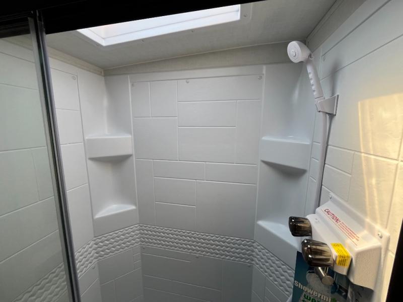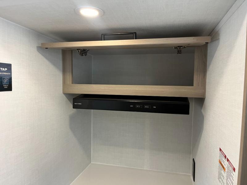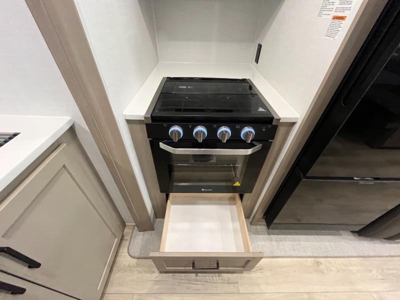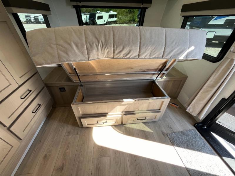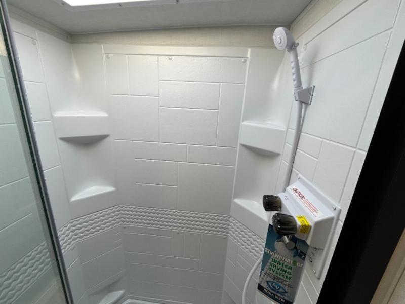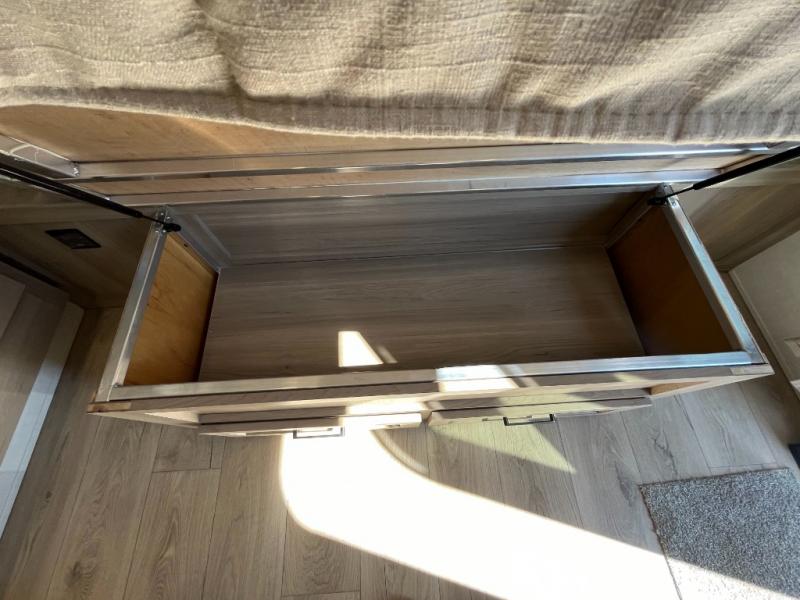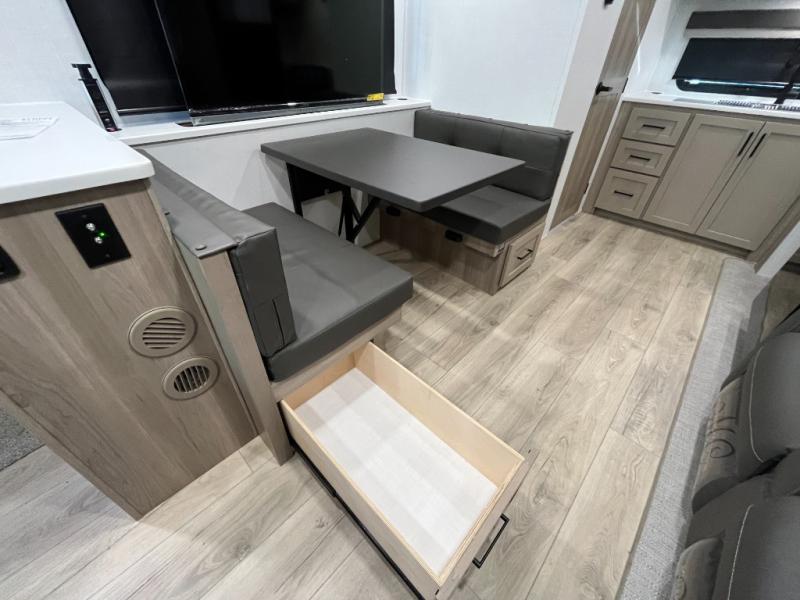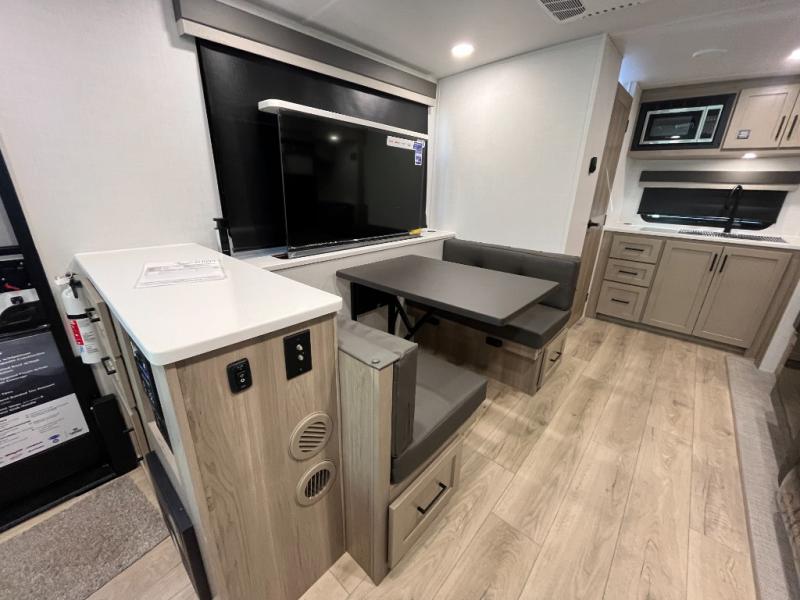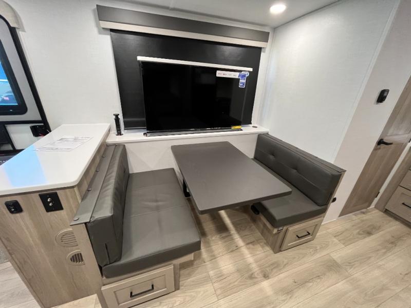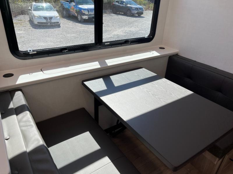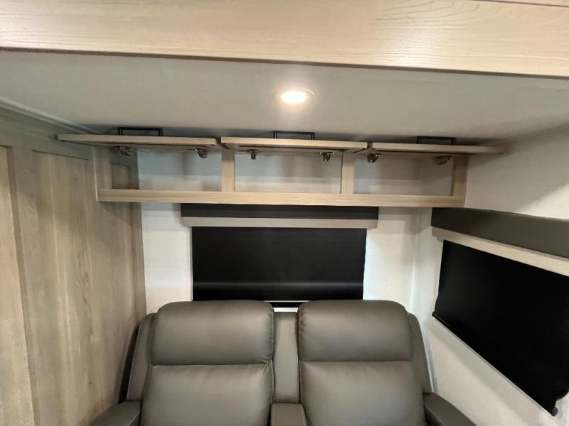 You'll be met with comfort at every turn in this spacious travel trailer. There is a large slide out which houses the theater seat, cooktop and refrigerator, plus a second slide out with a pantry/wardrobe for extra storage. You can sleep great each night on the front 60" x 74" queen bed, and there is flip-up storage underneath for extra blankets, boards games, and more. Once dinner has been made, you can dine at the booth dinette, or take your plate outdoors to relax under the 20' power awning. This unit also includes a full bath so you don't have to use the camp's facilities in the middle of the night!
