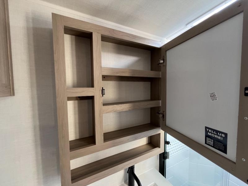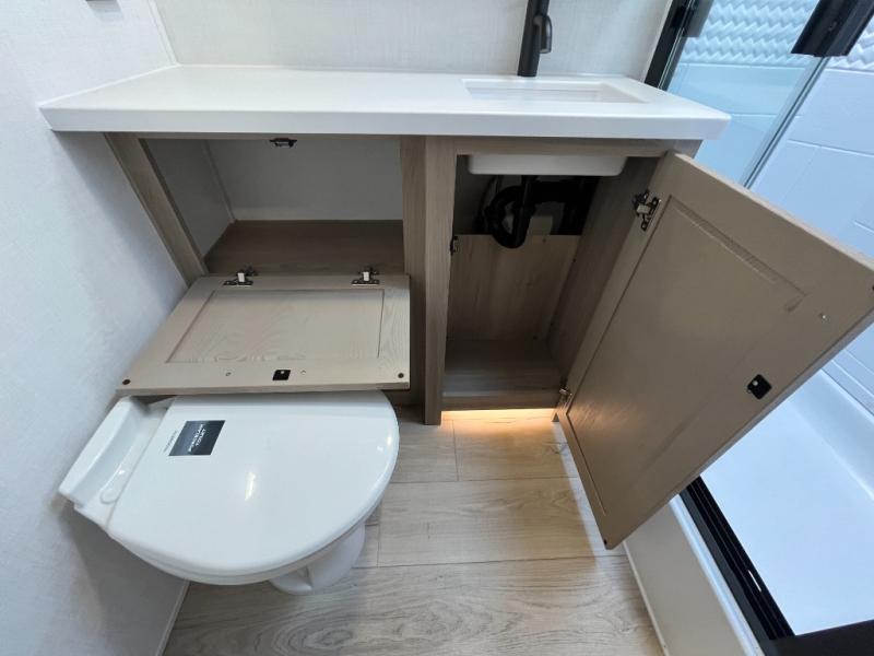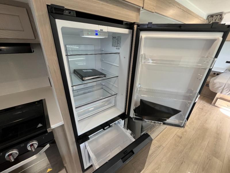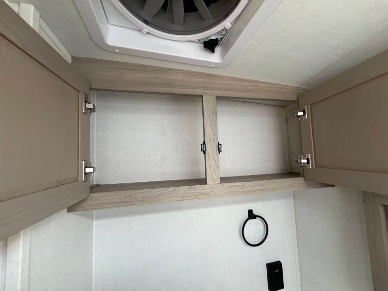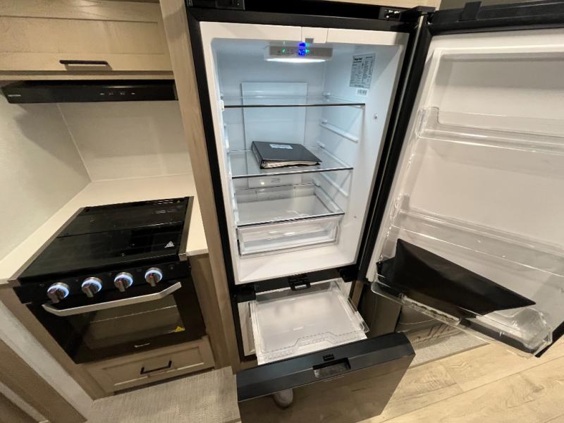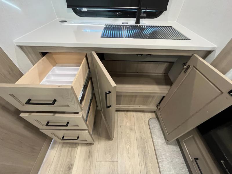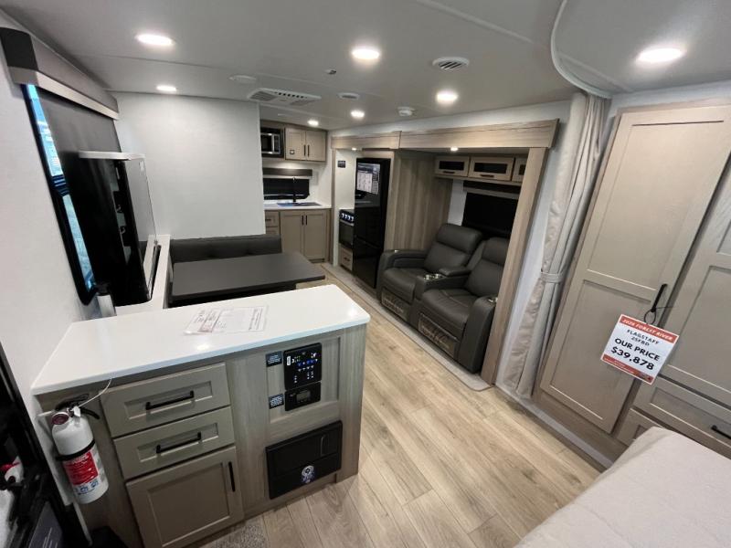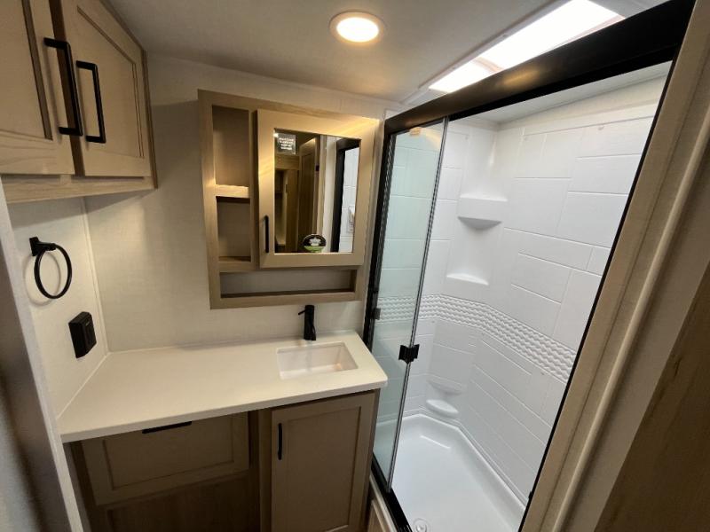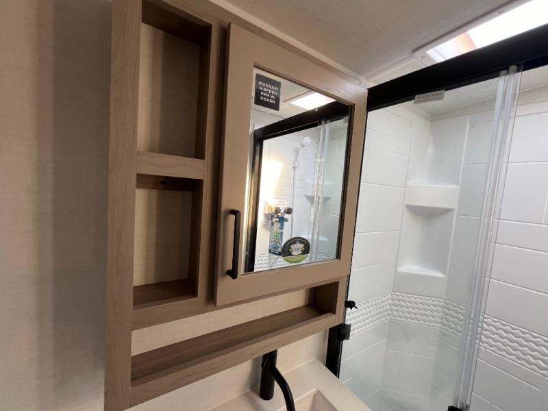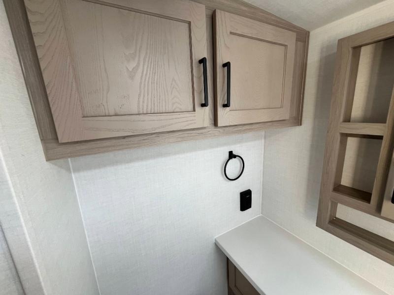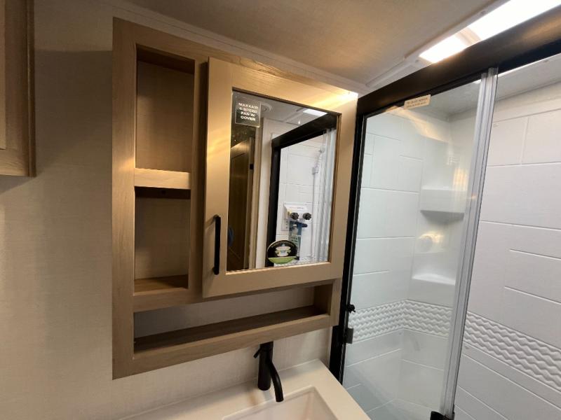 You'll be met with comfort at every turn in this spacious travel trailer. There is a large slide out which houses the theater seat, cooktop and refrigerator, plus a second slide out with a pantry/wardrobe for extra storage. You can sleep great each night on the front 60" x 74" queen bed, and there is flip-up storage underneath for extra blankets, boards games, and more. Once dinner has been made, you can dine at the booth dinette, or take your plate outdoors to relax under the 20' power awning. This unit also includes a full bath so you don't have to use the camp's facilities in the middle of the night!