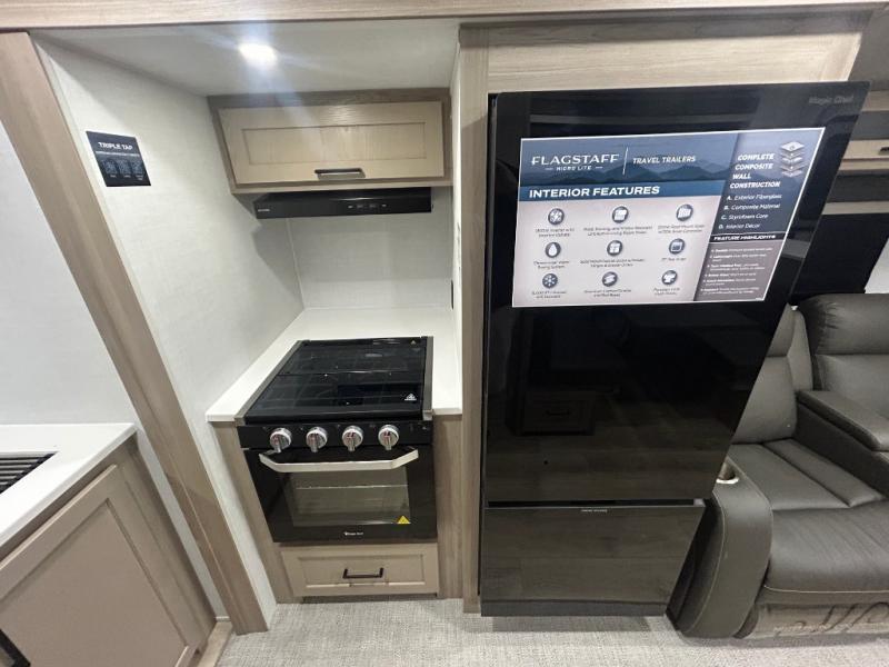 With any Flagstaff Micro Lite travel trailer by Forest River you will enjoy lightweight towing, durable construction, and added interior comforts to make each trip memorable! Each model features RoadTech tire pressure monitoring, Dexter Torflex axles, and nitrogen-filled Goodyear endurance tires for smooth towing from home to campground. The 6-sided aluminum framed construction provides a strong foundation so you can enjoy your RV for years to come, plus the radiant foil in the front cap, underbelly and slides help insulate your trailer. Additional exterior features include a 200W solar panel, back-up camera prep, frameless windows, and slam baggage doors. Each model includes the Great Expectations Package with roller shades, solid surface kitchen countertops, and hidden hinge cabinet doors. There is also an exterior hot/cold water port, outside speakers, a power tongue jack and stabilizer jacks, plus many more conveniences.