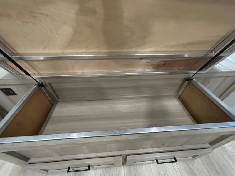 You'll be met with comfort at every turn in this spacious travel trailer. There is a large slide out which houses the theater seat, cooktop and refrigerator, plus a second slide out with a pantry/wardrobe for extra storage. You can sleep great each night on the front 60" x 74" queen bed, and there is flip-up storage underneath for extra blankets, boards games, and more. Once dinner has been made, you can dine at the booth dinette, or take your plate outdoors to relax under the 20' power awning. This unit also includes a full bath so you don't have to use the camp's facilities in the middle of the night!