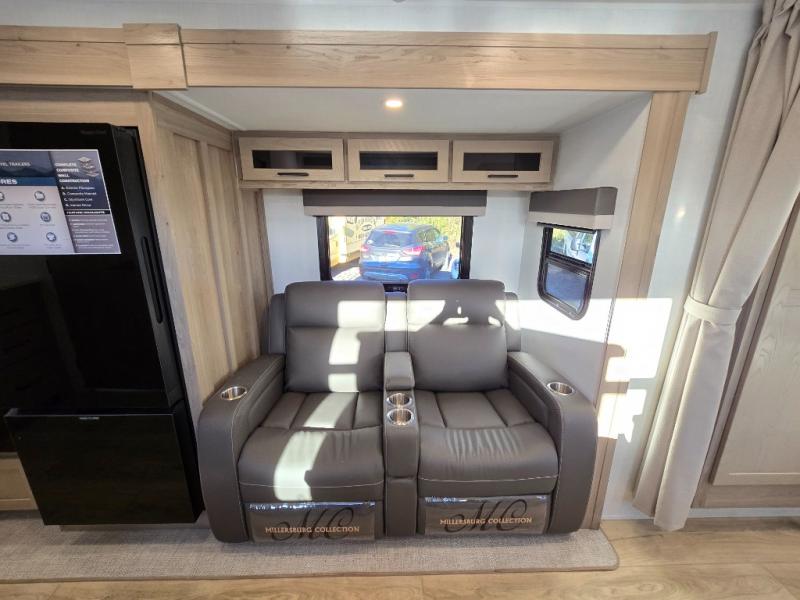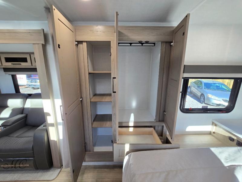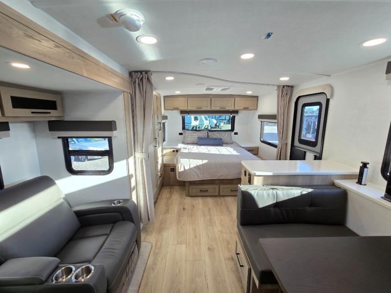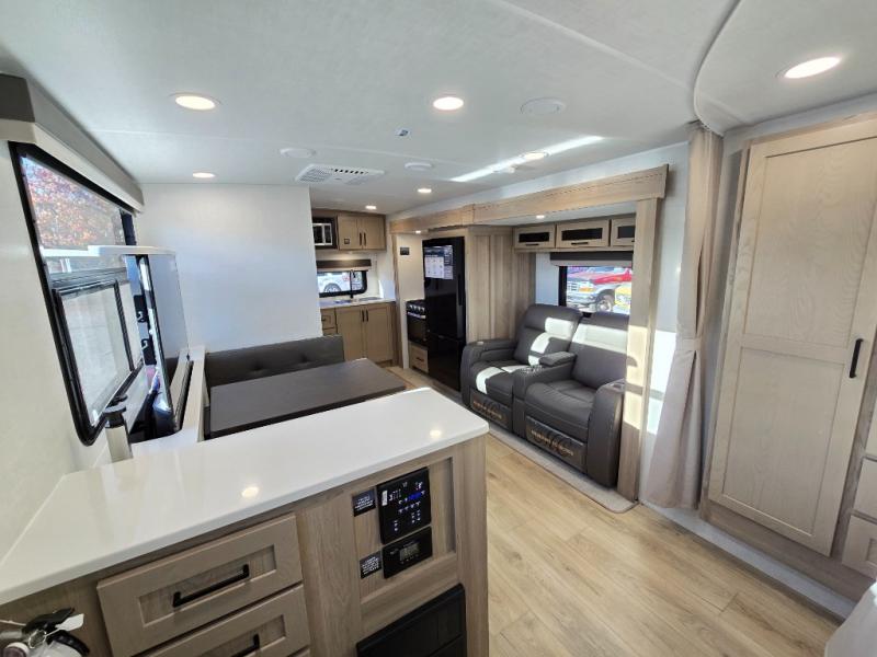 You'll be met with comfort at every turn in this spacious travel trailer. There is a large slide out which houses the theater seat, cooktop and refrigerator, plus a second slide out with a pantry/wardrobe for extra storage. You can sleep great each night on the front 60" x 74" queen bed, and there is flip-up storage underneath for extra blankets, boards games, and more. Once dinner has been made, you can dine at the booth dinette, or take your plate outdoors to relax under the 20' power awning. This unit also includes a full bath so you don't have to use the camp's facilities in the middle of the night!