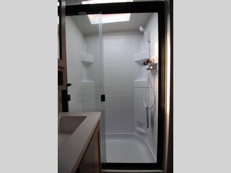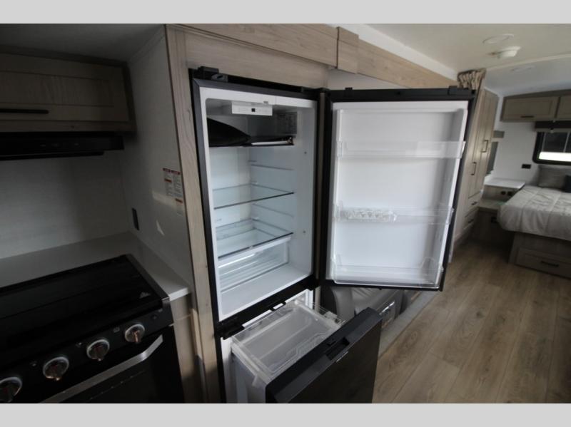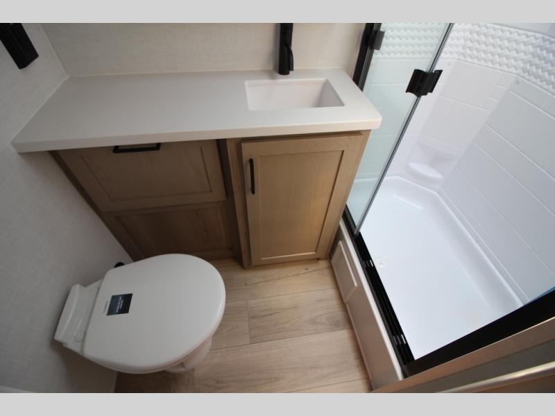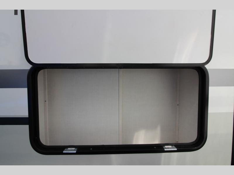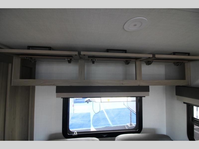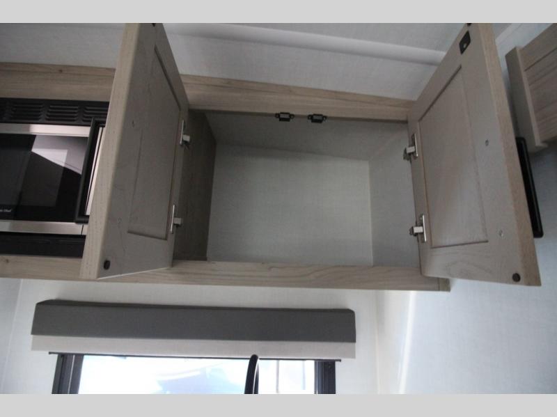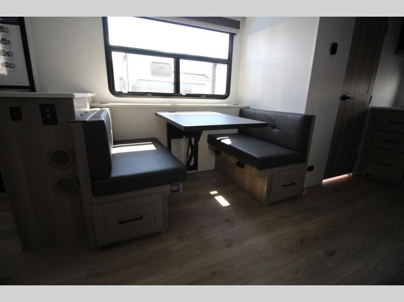 You'll be met with comfort at every turn in this spacious travel trailer. There is a large slide out which houses the theater seat, cooktop and refrigerator, plus a second slide out with a pantry/wardrobe for extra storage. You can sleep great each night on the front 60" x 74" queen bed, and there is flip-up storage underneath for extra blankets, boards games, and more. Once dinner has been made, you can dine at the booth dinette, or take your plate outdoors to relax under the 20' power awning. This unit also includes a full bath so you don't have to use the camp's facilities in the middle of the night!