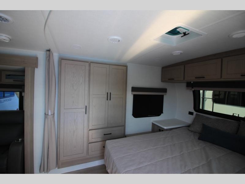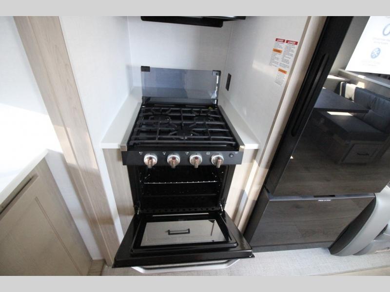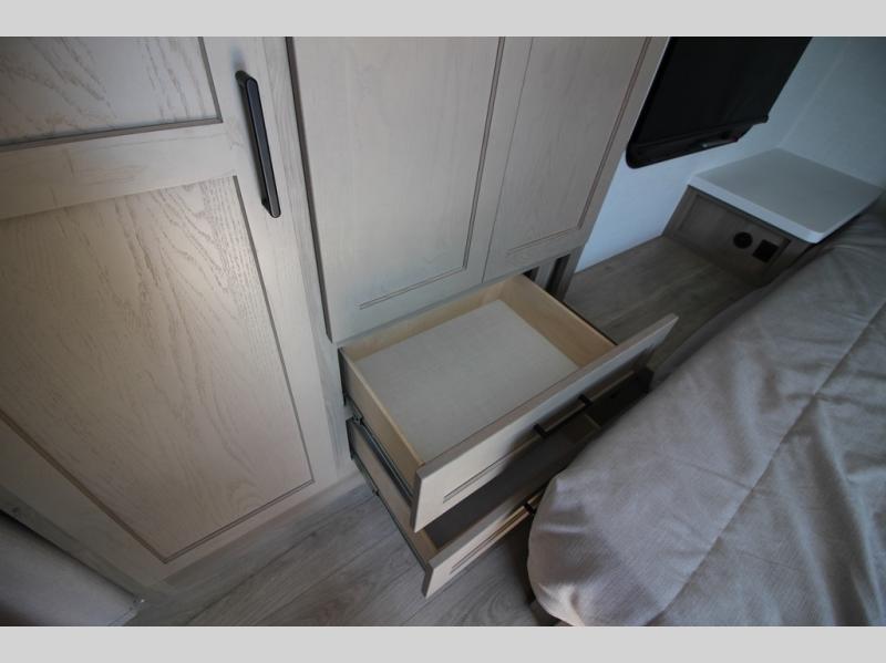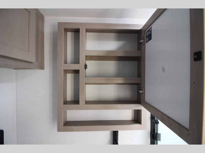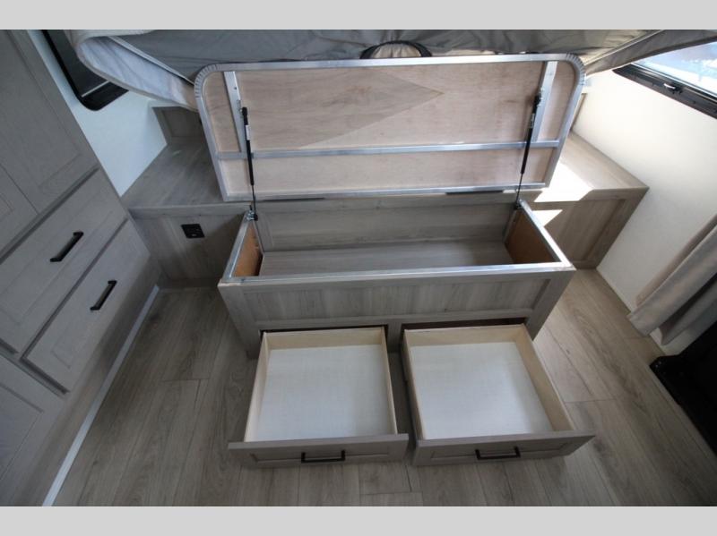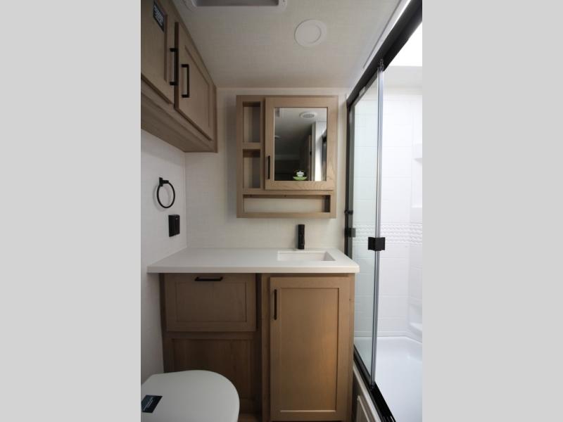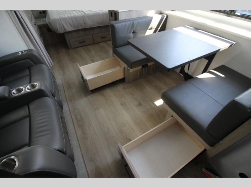You'll be met with comfort at every turn in this spacious travel trailer. There is a large slide out which houses the theater seat, cooktop and refrigerator, plus a second slide out with a pantry/wardrobe for extra storage. You can sleep great each night on the front 60" x 74" queen bed, and there is flip-up storage underneath for extra blankets, boards games, and more. Once dinner has been made, you can dine at the booth dinette, or take your plate outdoors to relax under the 20' power awning. This unit also includes a full bath so you don't have to use the camp's facilities in the middle of the night!