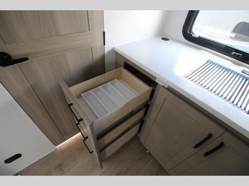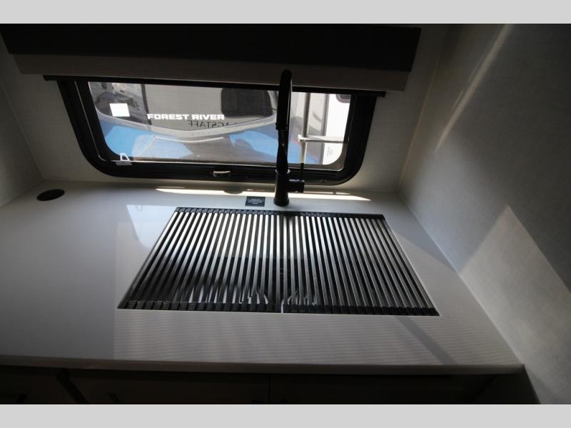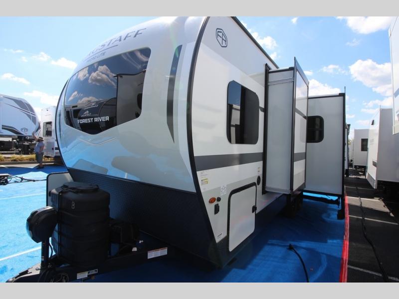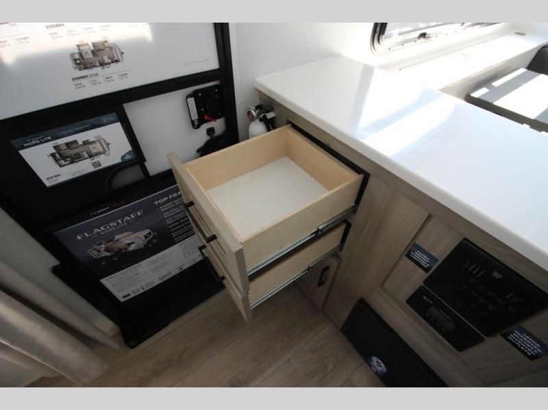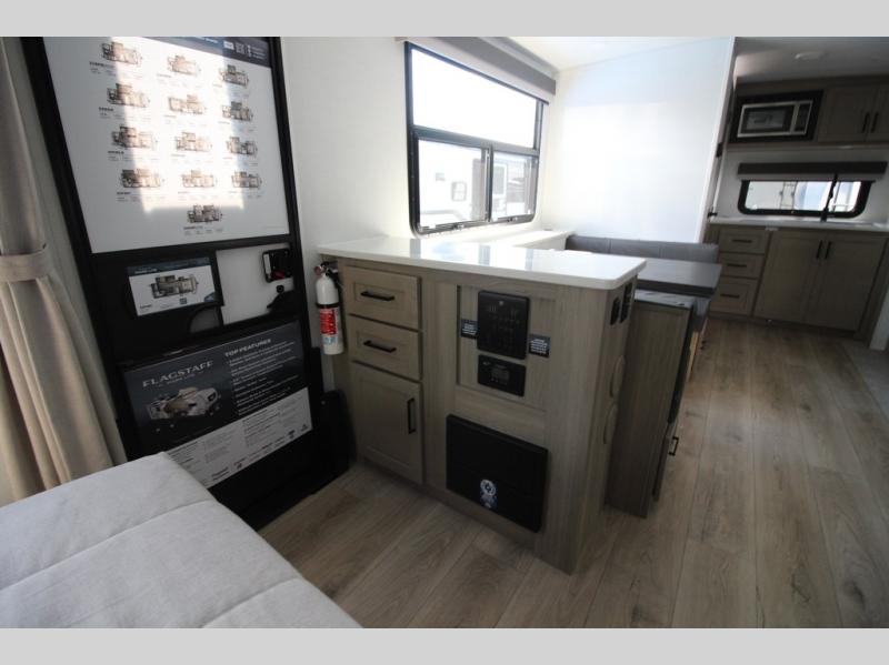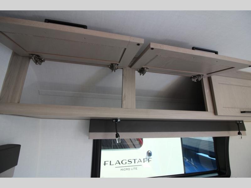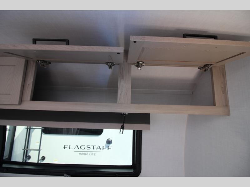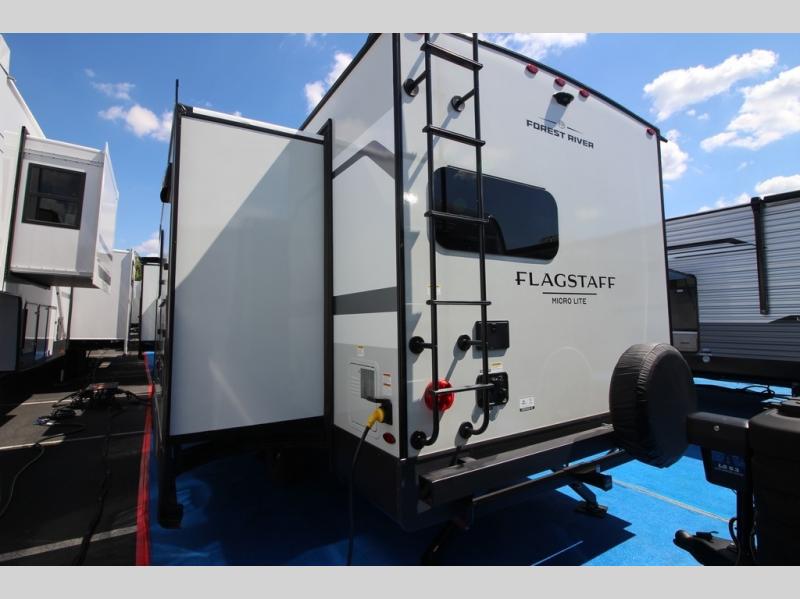With any Flagstaff Micro Lite travel trailer by Forest River you will enjoy lightweight towing, durable construction, and added interior comforts to make each trip memorable! Each model features RoadTech tire pressure monitoring, Dexter Torflex axles, and nitrogen-filled Goodyear endurance tires for smooth towing from home to campground. The 6-sided aluminum framed construction provides a strong foundation so you can enjoy your RV for years to come, plus the radiant foil in the front cap, underbelly and slides help insulate your trailer. Additional exterior features include a 200W solar panel, back-up camera prep, frameless windows, and slam baggage doors. Each model includes the Great Expectations Package with roller shades, solid surface kitchen countertops, and hidden hinge cabinet doors. There is also an exterior hot/cold water port, outside speakers, a power tongue jack and stabilizer jacks, plus many more conveniences.