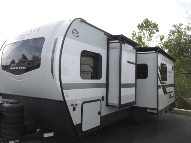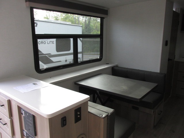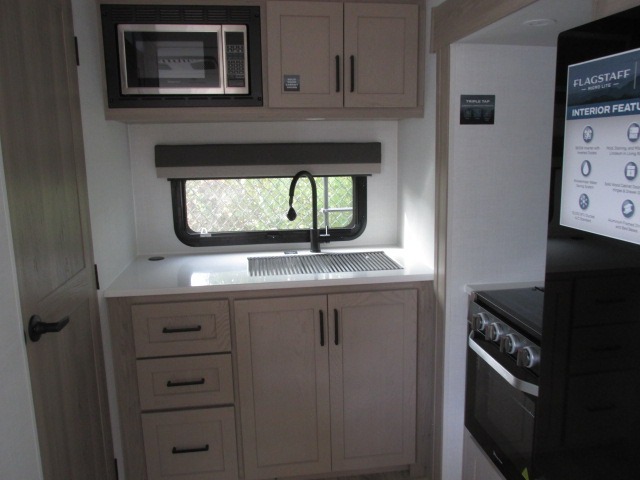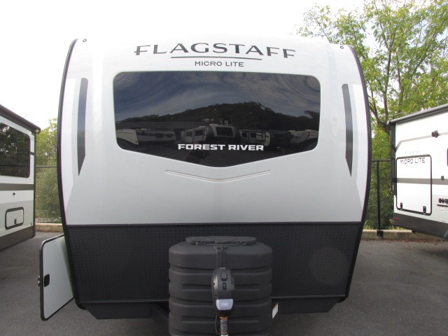 With any Flagstaff Micro Lite travel trailer by Forest River you will enjoy lightweight towing, durable construction, and added interior comforts to make each trip memorable! Each model features RoadTech tire pressure monitoring, Dexter Torflex axles, and nitrogen-filled Goodyear endurance tires for smooth towing from home to campground. The 6-sided aluminum framed construction provides a strong foundation so you can enjoy your RV for years to come, plus the radiant foil in the front cap, underbelly and slides help insulate your trailer. Additional exterior features include a 200W solar panel, back-up camera prep, frameless windows, and slam baggage doors. Each model includes the Great Expectations Package with roller shades, solid surface kitchen countertops, and hidden hinge cabinet doors. There is also an exterior hot/cold water port, outside speakers, a power tongue jack and stabilizer jacks, plus many more conveniences.