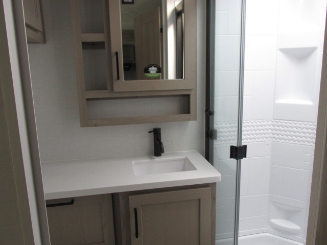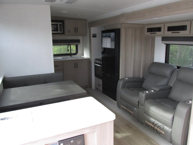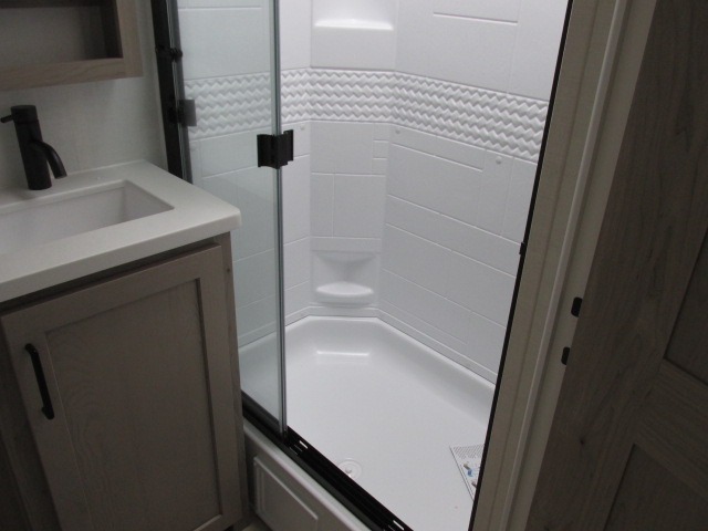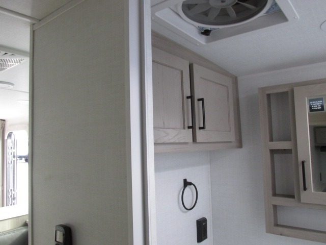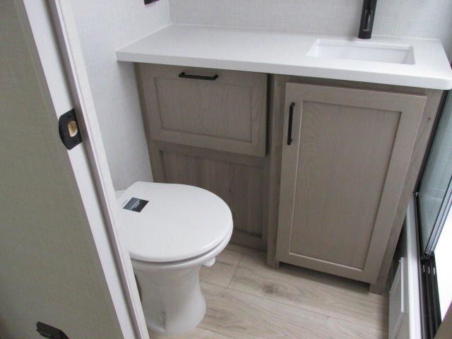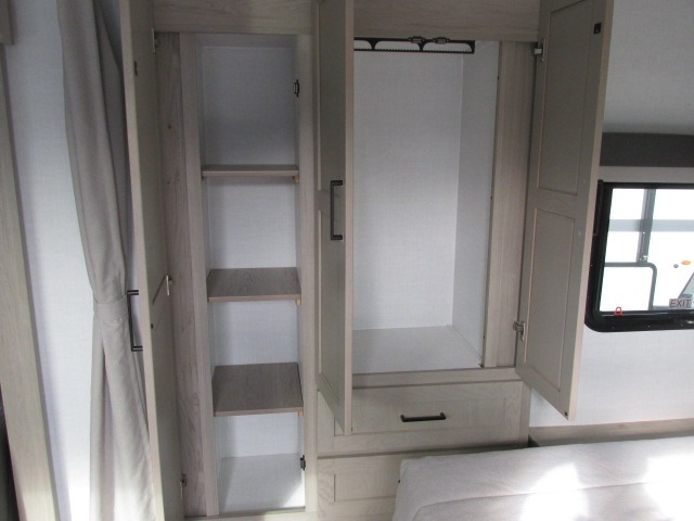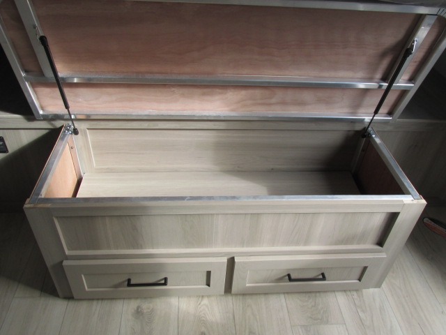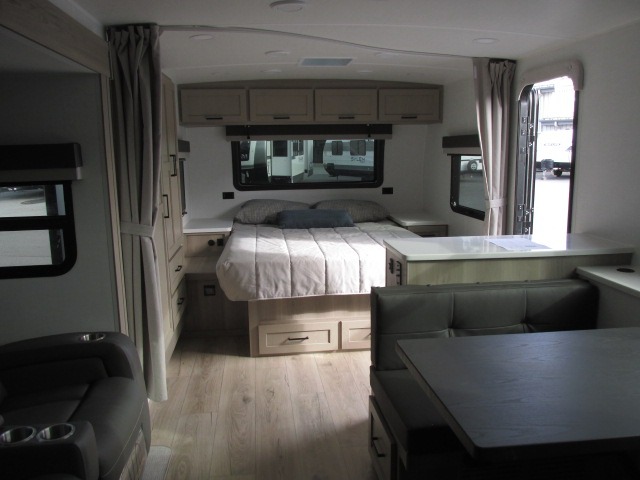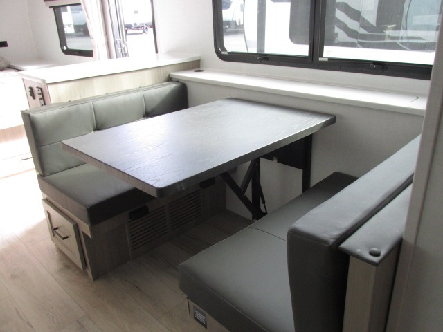 You'll be met with comfort at every turn in this spacious travel trailer. There is a large slide out which houses the theater seat, cooktop and refrigerator, plus a second slide out with a pantry/wardrobe for extra storage. You can sleep great each night on the front 60" x 74" queen bed, and there is flip-up storage underneath for extra blankets, boards games, and more. Once dinner has been made, you can dine at the booth dinette, or take your plate outdoors to relax under the 20' power awning. This unit also includes a full bath so you don't have to use the camp's facilities in the middle of the night!