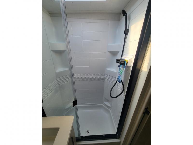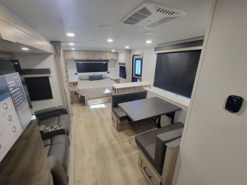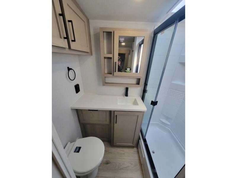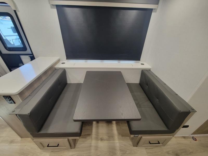You'll be met with comfort at every turn in this spacious travel trailer. There is a large slide out which houses the theater seat, cooktop and refrigerator, plus a second slide out with a pantry/wardrobe for extra storage. You can sleep great each night on the front 60" x 74" queen bed, and there is flip-up storage underneath for extra blankets, boards games, and more. Once dinner has been made, you can dine at the booth dinette, or take your plate outdoors to relax under the 20' power awning. This unit also includes a full bath so you don't have to use the camp's facilities in the middle of the night!