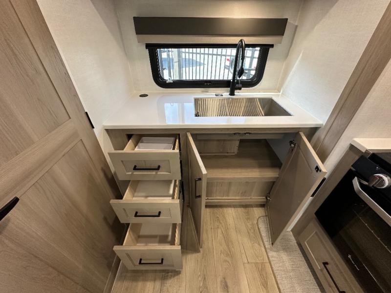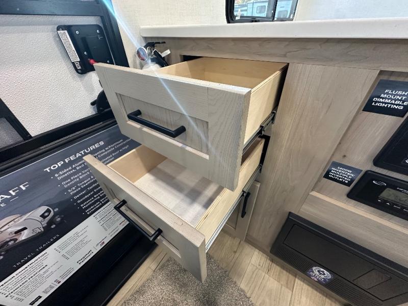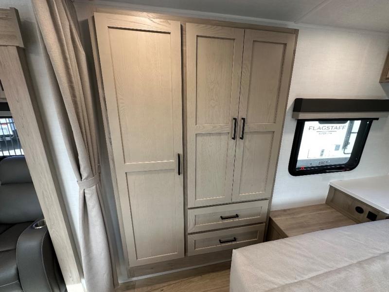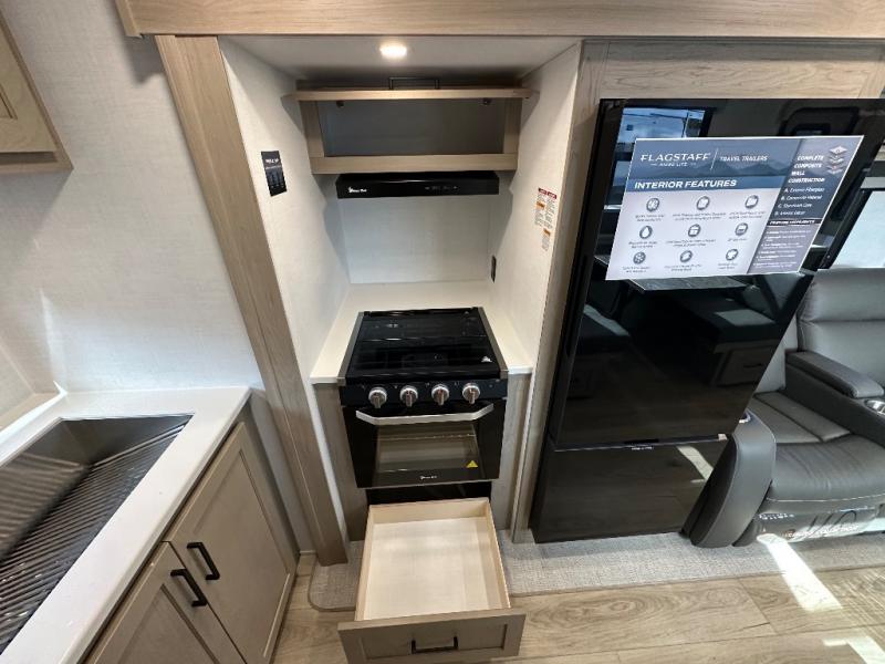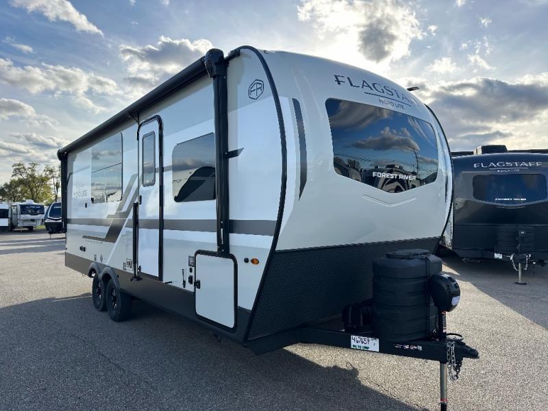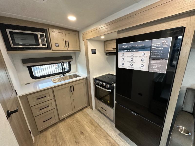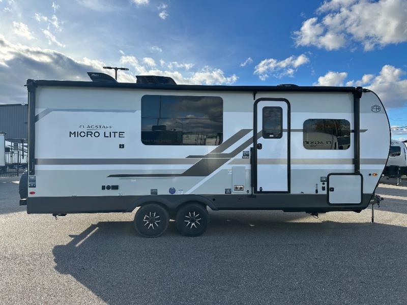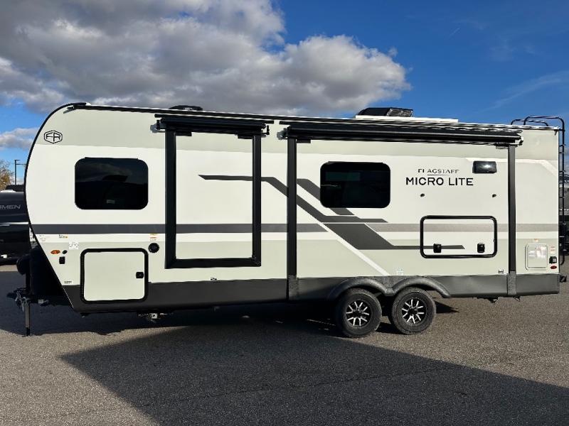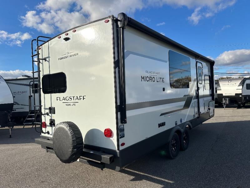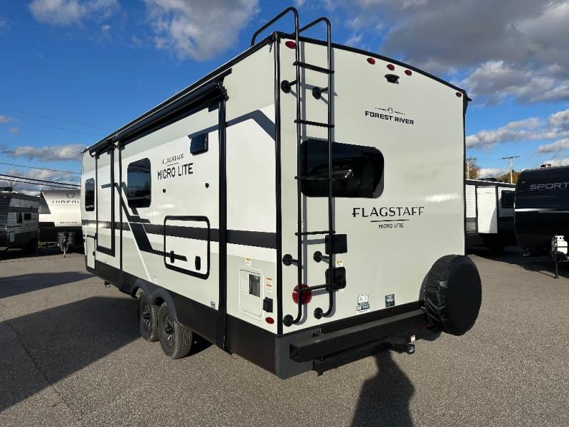 With any Flagstaff Micro Lite travel trailer by Forest River you will enjoy lightweight towing, durable construction, and added interior comforts to make each trip memorable! Each model features RoadTech tire pressure monitoring, Dexter Torflex axles, and nitrogen-filled Goodyear endurance tires for smooth towing from home to campground. The 6-sided aluminum framed construction provides a strong foundation so you can enjoy your RV for years to come, plus the radiant foil in the front cap, underbelly and slides help insulate your trailer. Additional exterior features include a 200W solar panel, back-up camera prep, frameless windows, and slam baggage doors. Each model includes the Great Expectations Package with roller shades, solid surface kitchen countertops, and hidden hinge cabinet doors. There is also an exterior hot/cold water port, outside speakers, a power tongue jack and stabilizer jacks, plus many more conveniences.