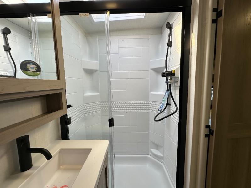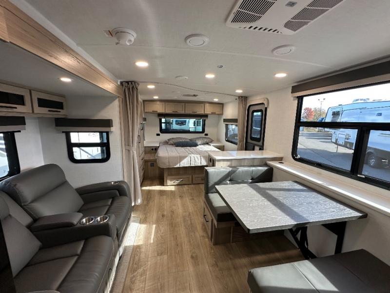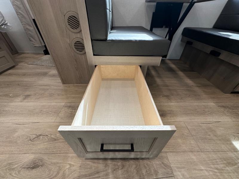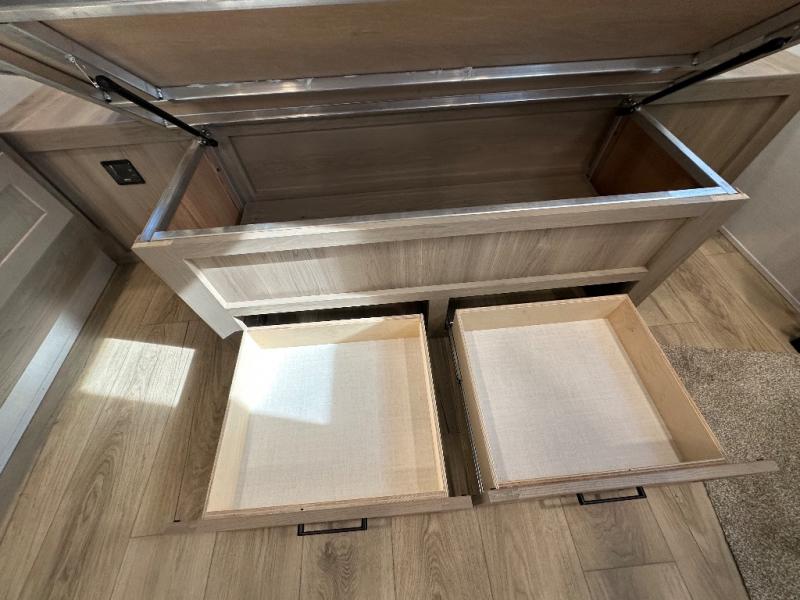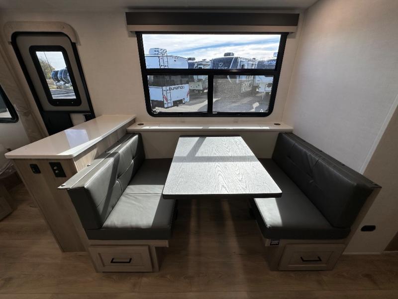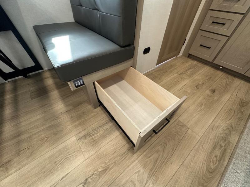 You'll be met with comfort at every turn in this spacious travel trailer. There is a large slide out which houses the theater seat, cooktop and refrigerator, plus a second slide out with a pantry/wardrobe for extra storage. You can sleep great each night on the front 60" x 74" queen bed, and there is flip-up storage underneath for extra blankets, boards games, and more. Once dinner has been made, you can dine at the booth dinette, or take your plate outdoors to relax under the 20' power awning. This unit also includes a full bath so you don't have to use the camp's facilities in the middle of the night!