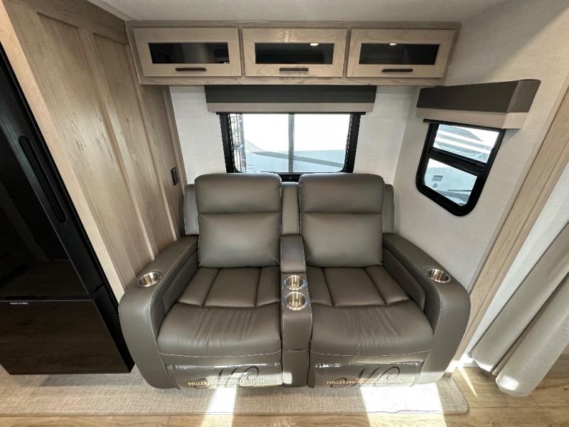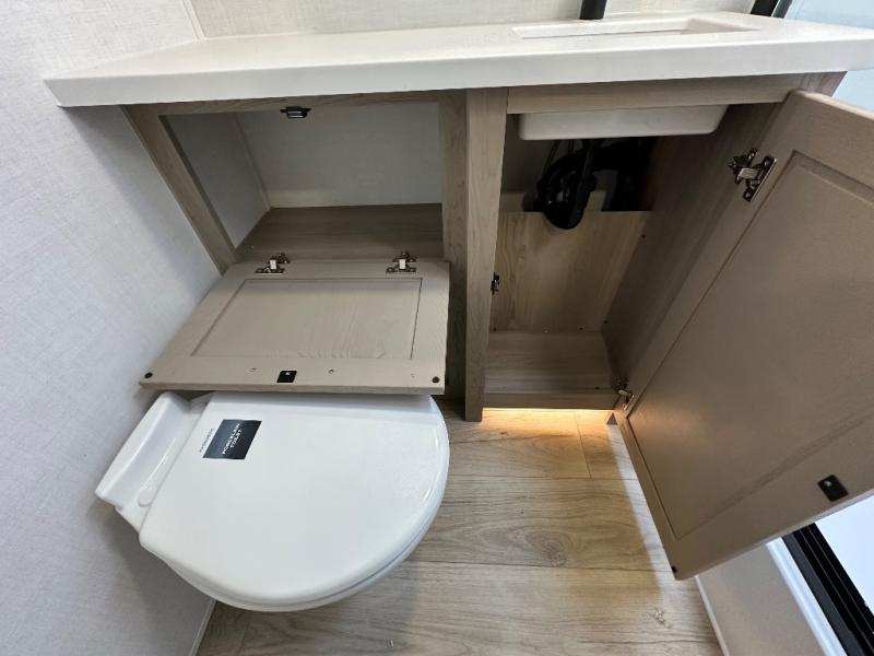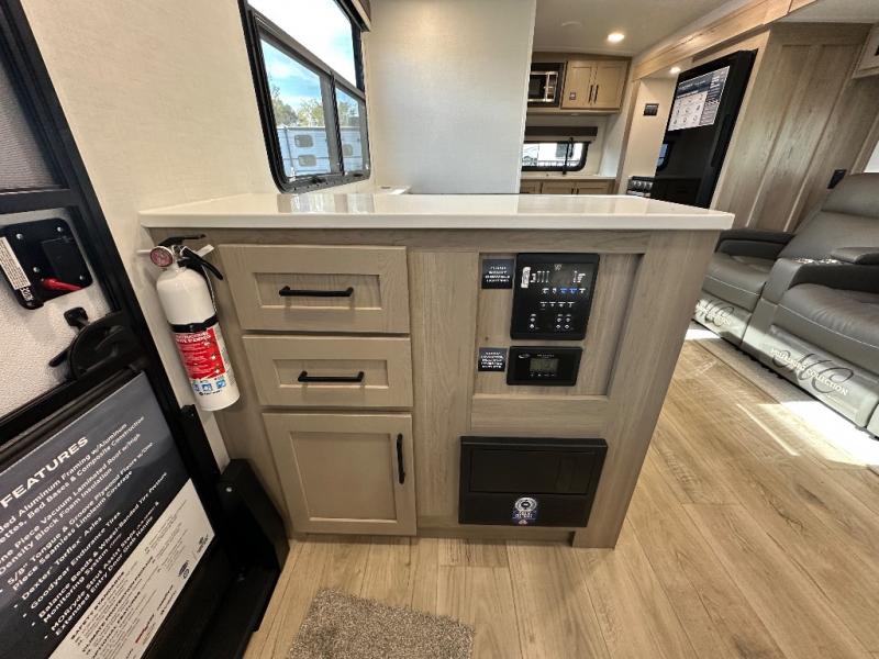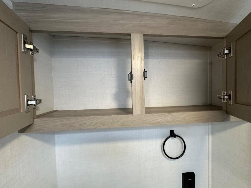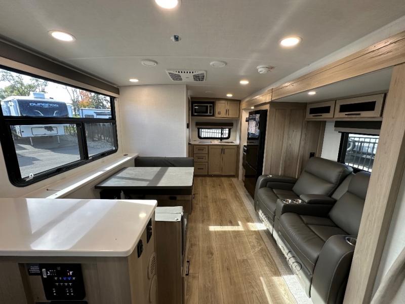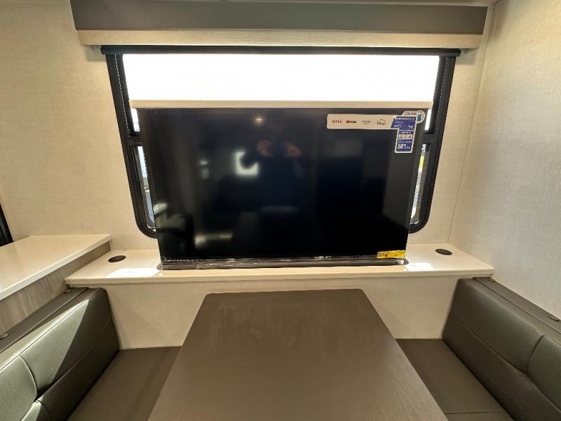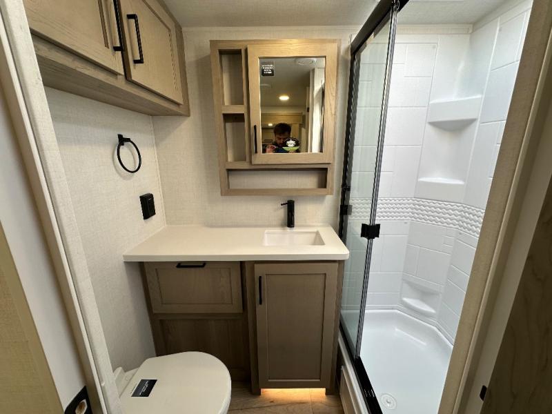 You'll be met with comfort at every turn in this spacious travel trailer. There is a large slide out which houses the theater seat, cooktop and refrigerator, plus a second slide out with a pantry/wardrobe for extra storage. You can sleep great each night on the front 60" x 74" queen bed, and there is flip-up storage underneath for extra blankets, boards games, and more. Once dinner has been made, you can dine at the booth dinette, or take your plate outdoors to relax under the 20' power awning. This unit also includes a full bath so you don't have to use the camp's facilities in the middle of the night!