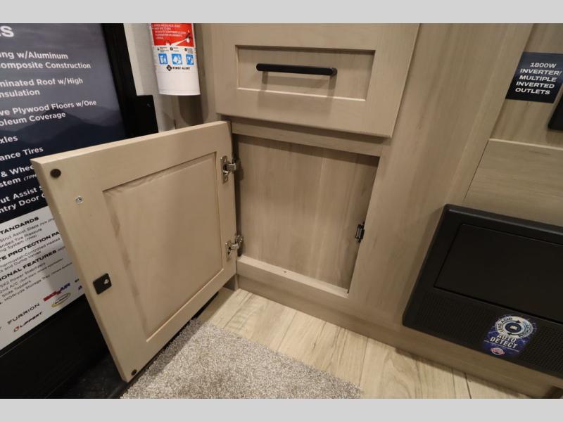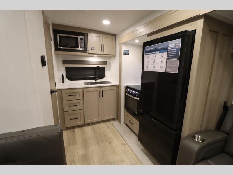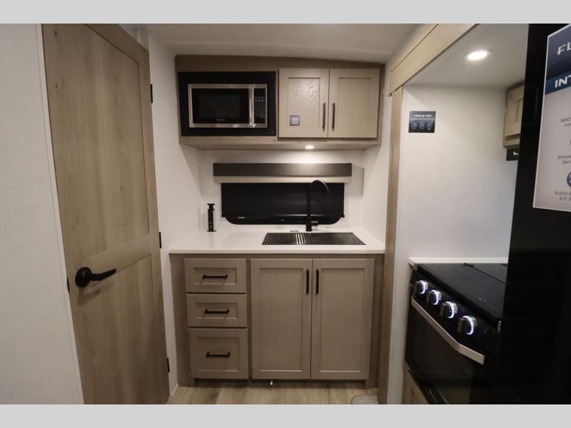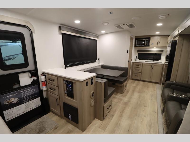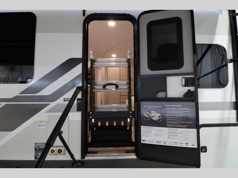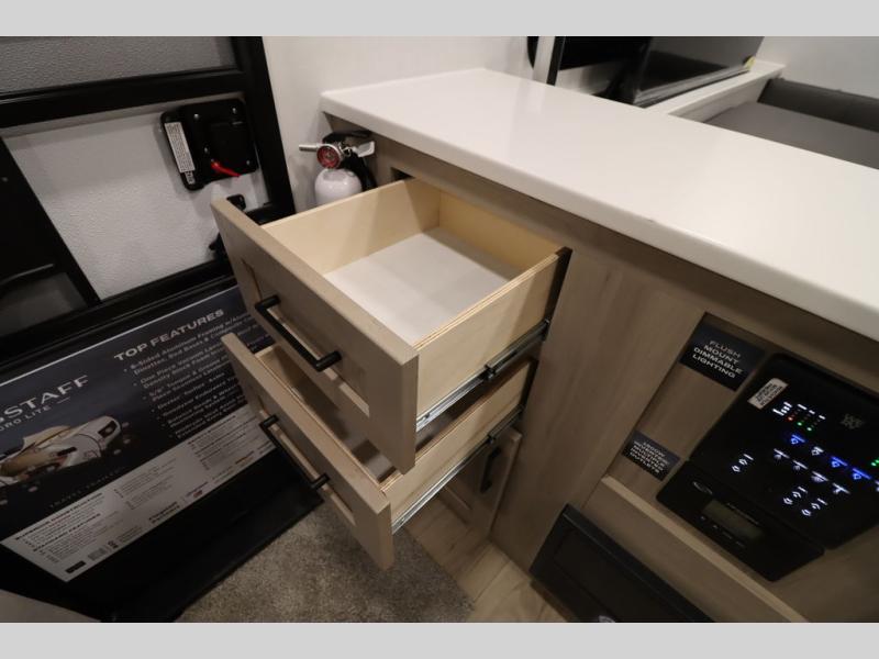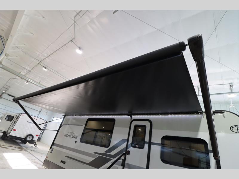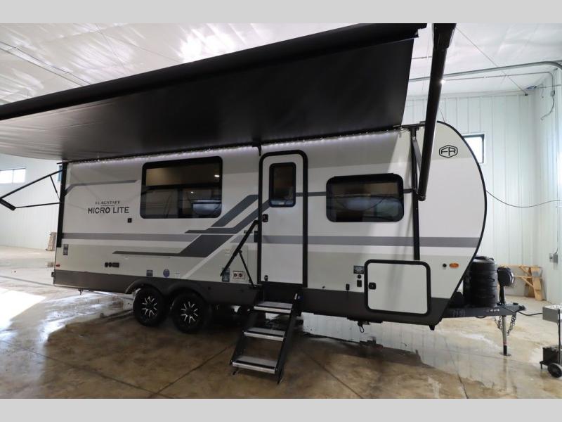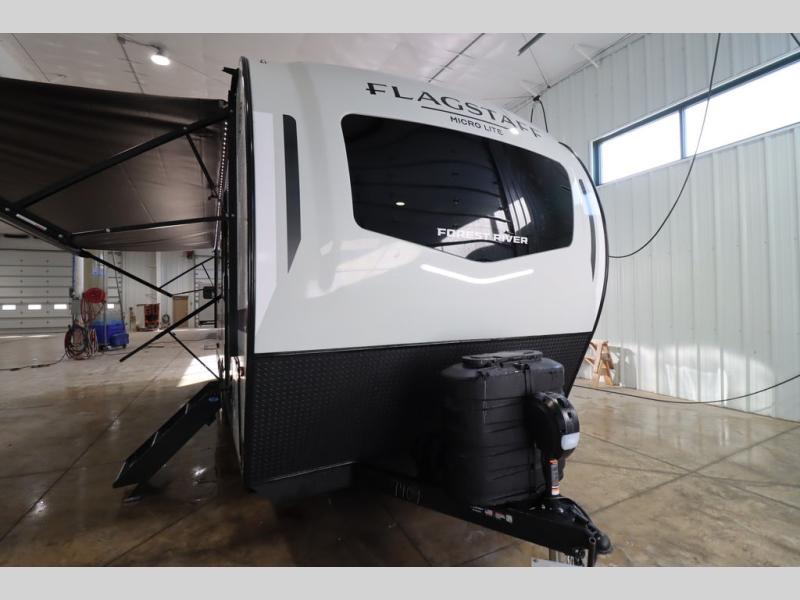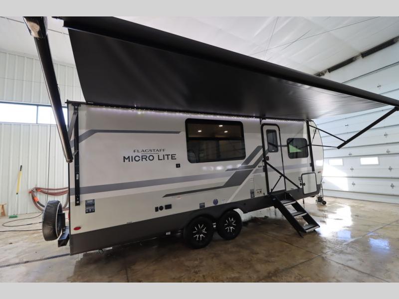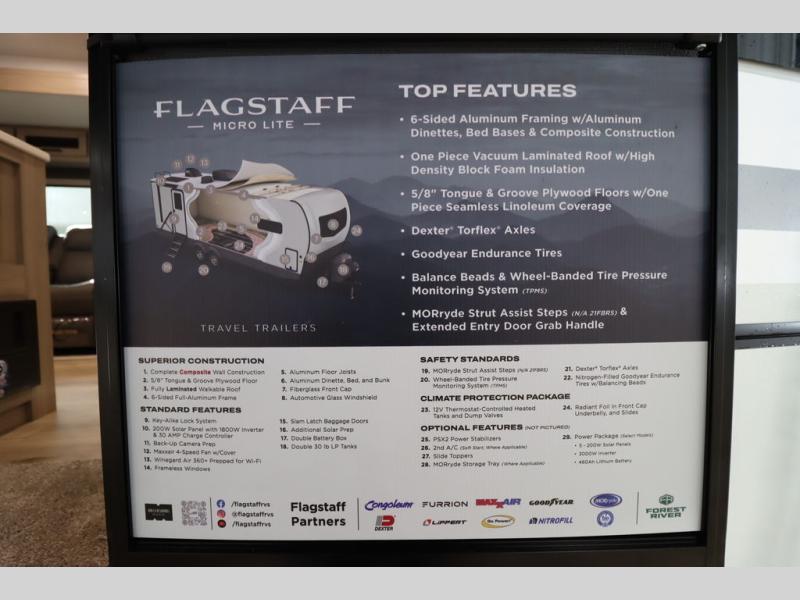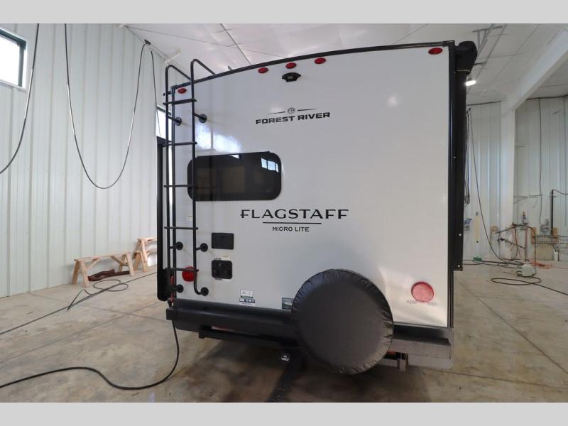 With any Flagstaff Micro Lite travel trailer by Forest River you will enjoy lightweight towing, durable construction, and added interior comforts to make each trip memorable! Each model features RoadTech tire pressure monitoring, Dexter Torflex axles, and nitrogen-filled Goodyear endurance tires for smooth towing from home to campground. The 6-sided aluminum framed construction provides a strong foundation so you can enjoy your RV for years to come, plus the radiant foil in the front cap, underbelly and slides help insulate your trailer. Additional exterior features include a 200W solar panel, back-up camera prep, frameless windows, and slam baggage doors. Each model includes the Great Expectations Package with roller shades, solid surface kitchen countertops, and hidden hinge cabinet doors. There is also an exterior hot/cold water port, outside speakers, a power tongue jack and stabilizer jacks, plus many more conveniences.