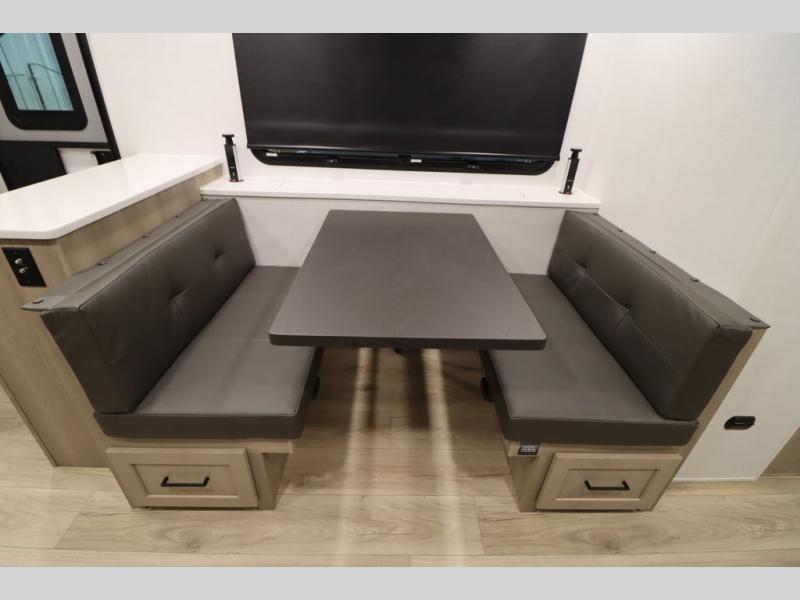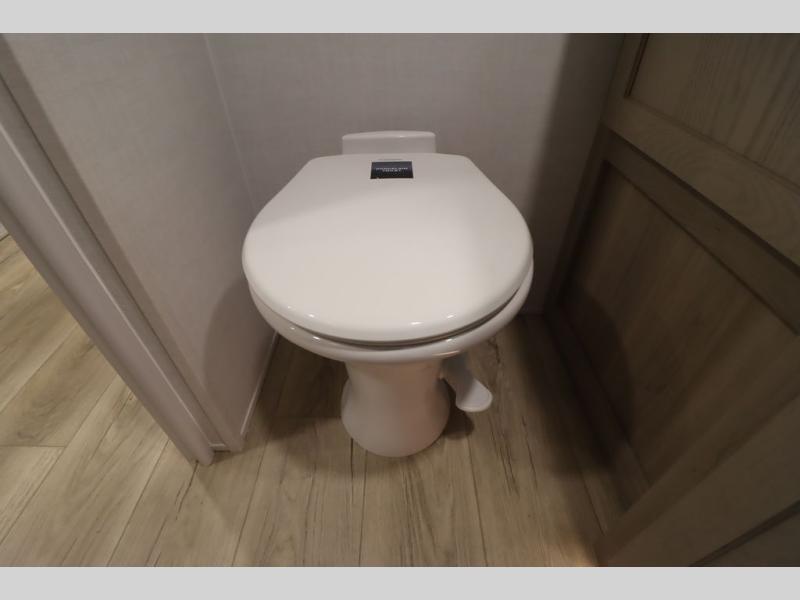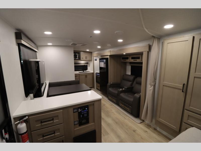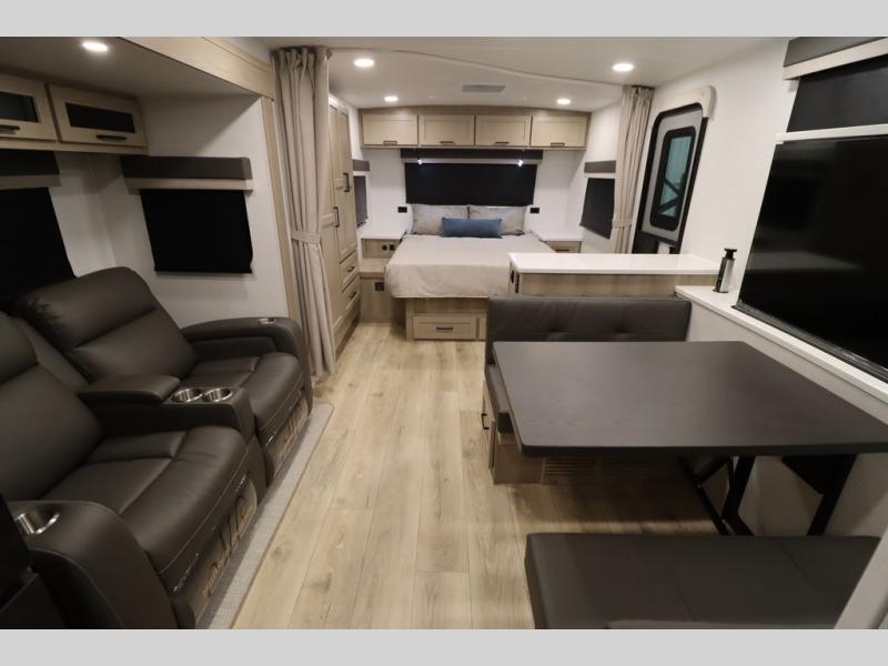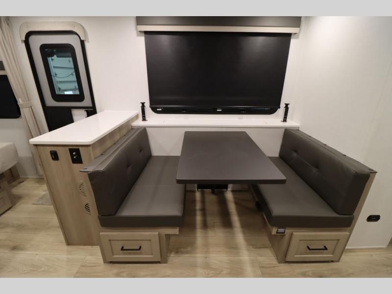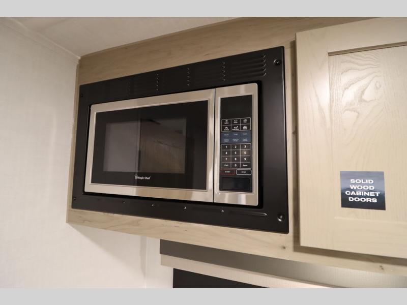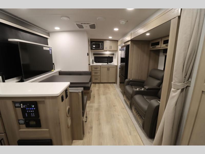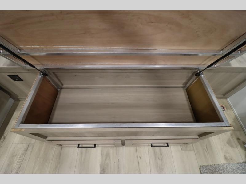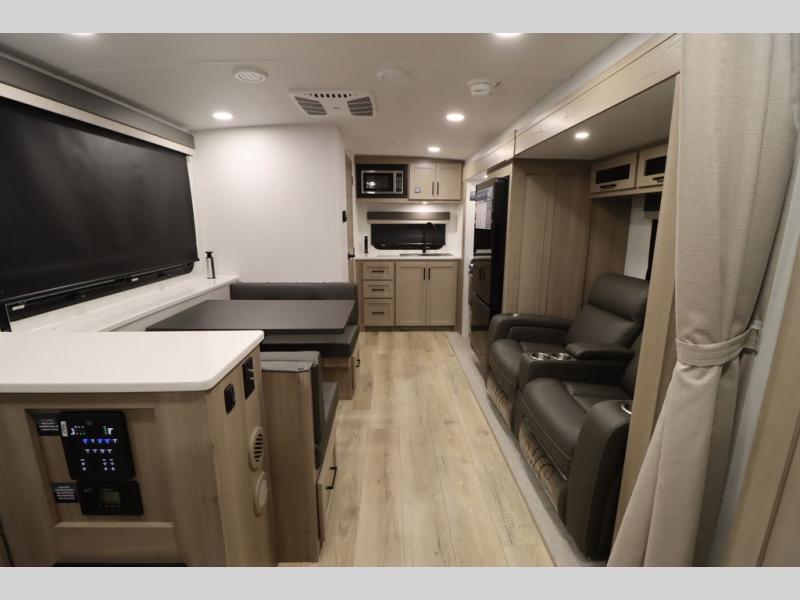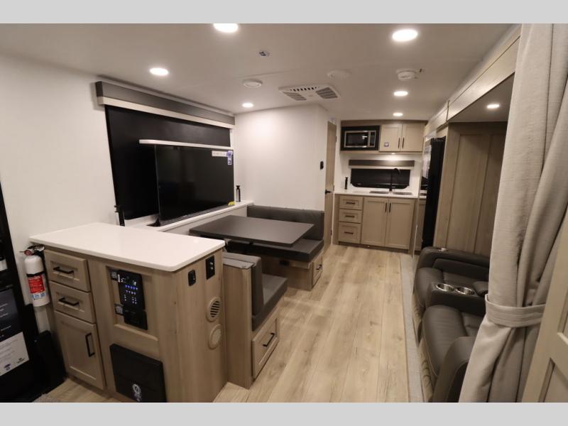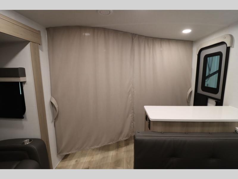 You'll be met with comfort at every turn in this spacious travel trailer. There is a large slide out which houses the theater seat, cooktop and refrigerator, plus a second slide out with a pantry/wardrobe for extra storage. You can sleep great each night on the front 60" x 74" queen bed, and there is flip-up storage underneath for extra blankets, boards games, and more. Once dinner has been made, you can dine at the booth dinette, or take your plate outdoors to relax under the 20' power awning. This unit also includes a full bath so you don't have to use the camp's facilities in the middle of the night!
