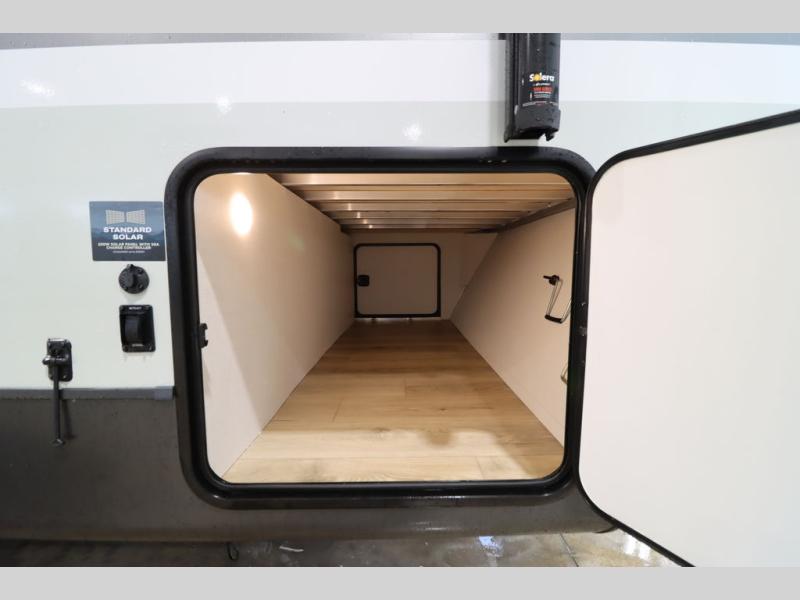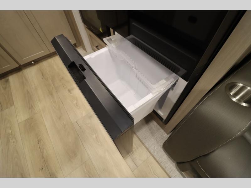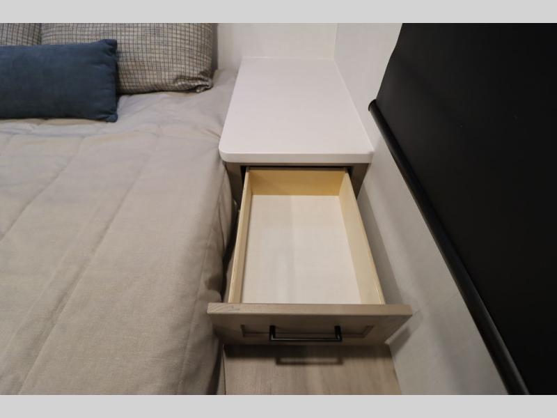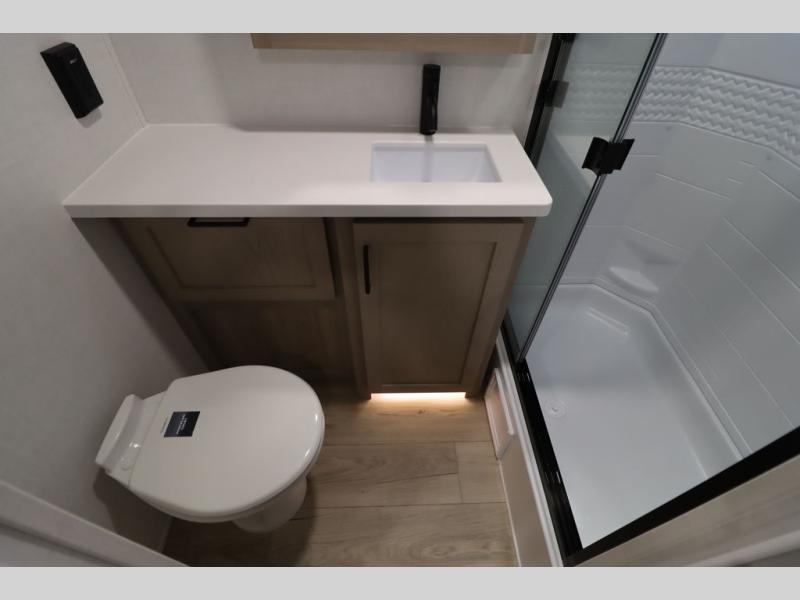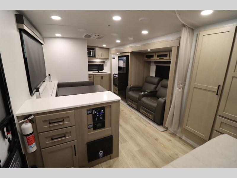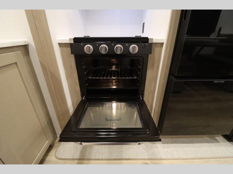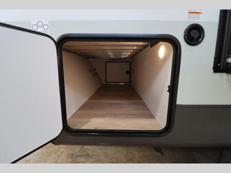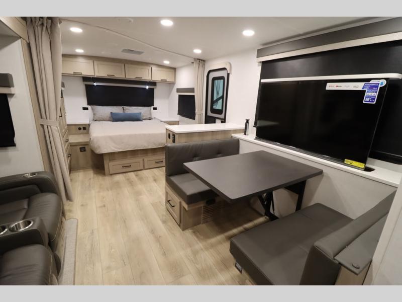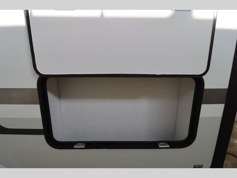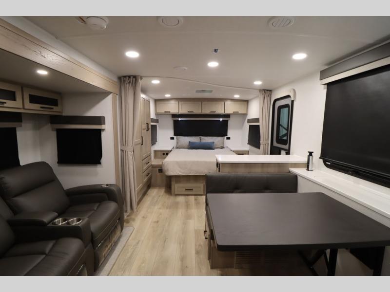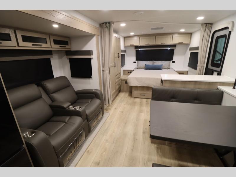 You'll be met with comfort at every turn in this spacious travel trailer. There is a large slide out which houses the theater seat, cooktop and refrigerator, plus a second slide out with a pantry/wardrobe for extra storage. You can sleep great each night on the front 60" x 74" queen bed, and there is flip-up storage underneath for extra blankets, boards games, and more. Once dinner has been made, you can dine at the booth dinette, or take your plate outdoors to relax under the 20' power awning. This unit also includes a full bath so you don't have to use the camp's facilities in the middle of the night!