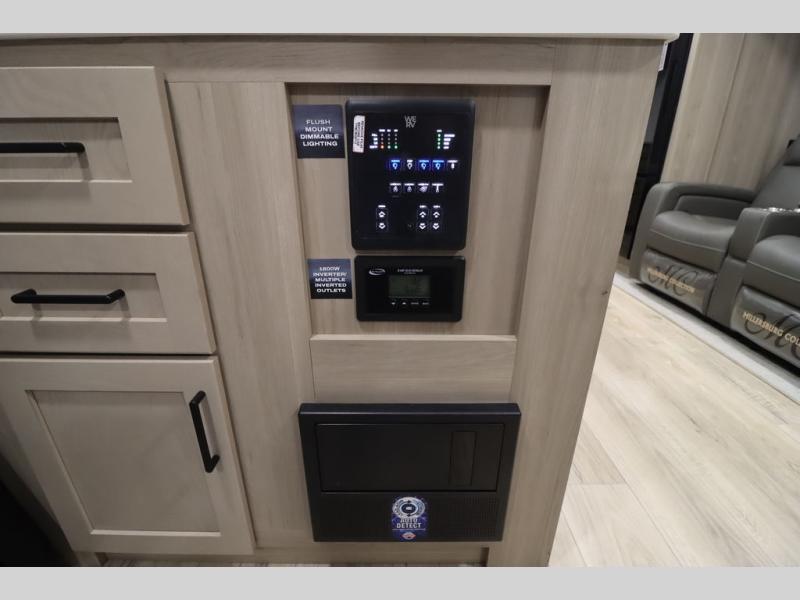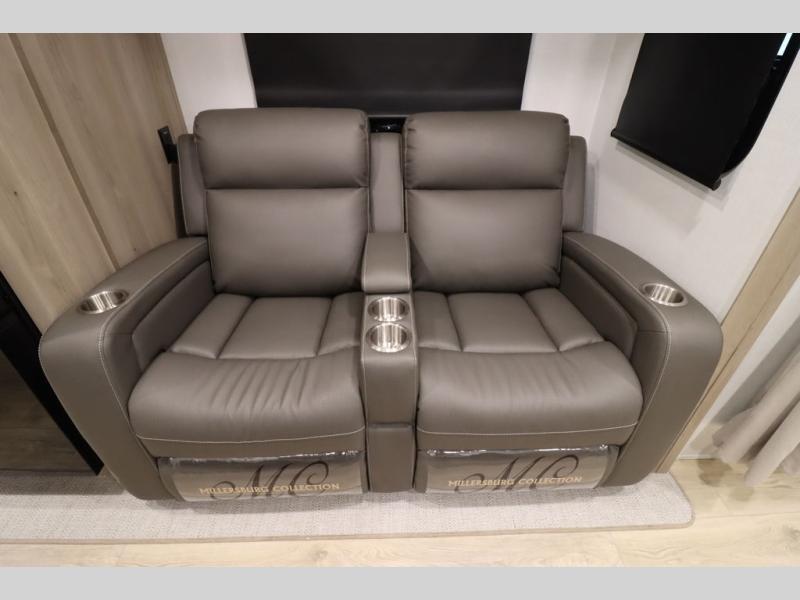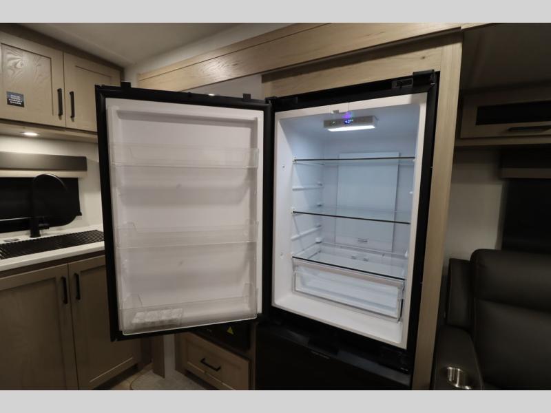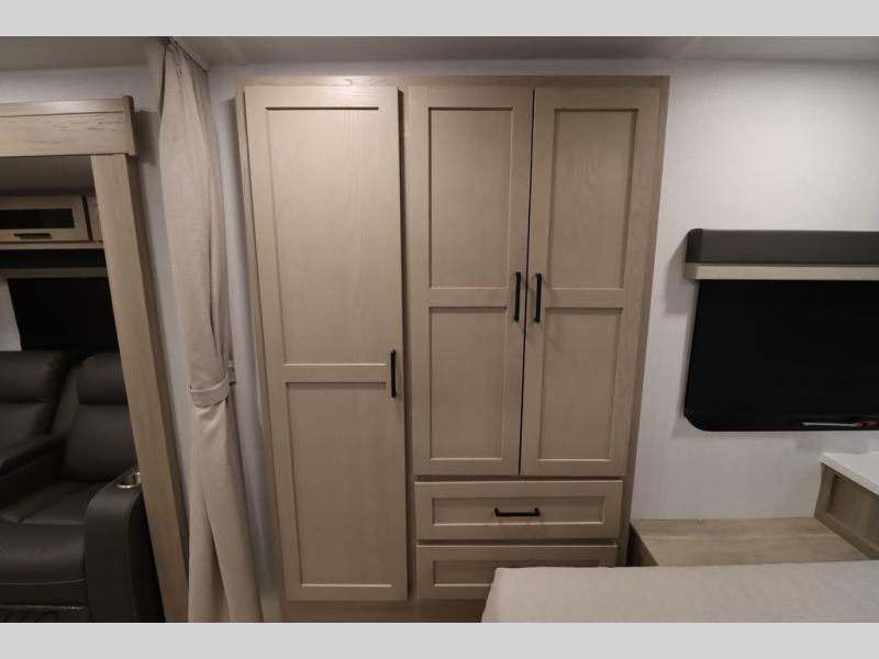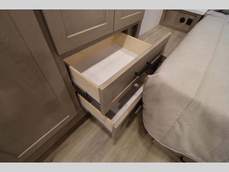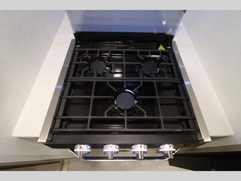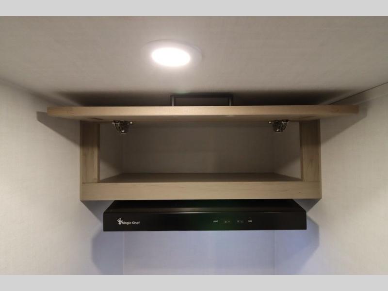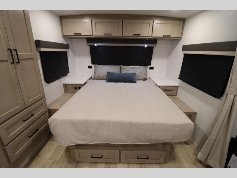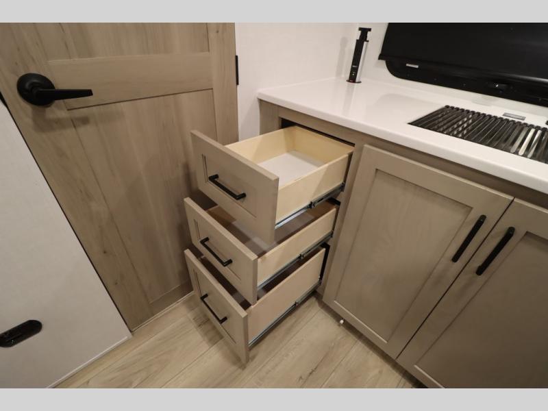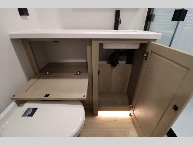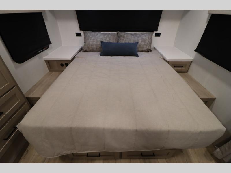 You'll be met with comfort at every turn in this spacious travel trailer. There is a large slide out which houses the theater seat, cooktop and refrigerator, plus a second slide out with a pantry/wardrobe for extra storage. You can sleep great each night on the front 60" x 74" queen bed, and there is flip-up storage underneath for extra blankets, boards games, and more. Once dinner has been made, you can dine at the booth dinette, or take your plate outdoors to relax under the 20' power awning. This unit also includes a full bath so you don't have to use the camp's facilities in the middle of the night!