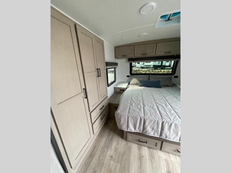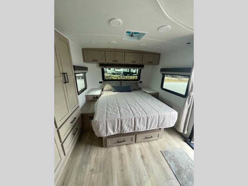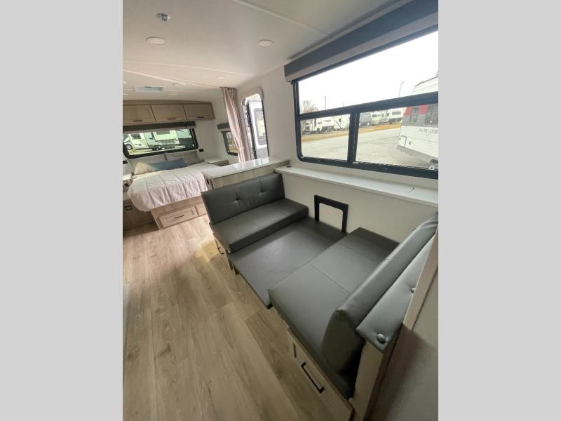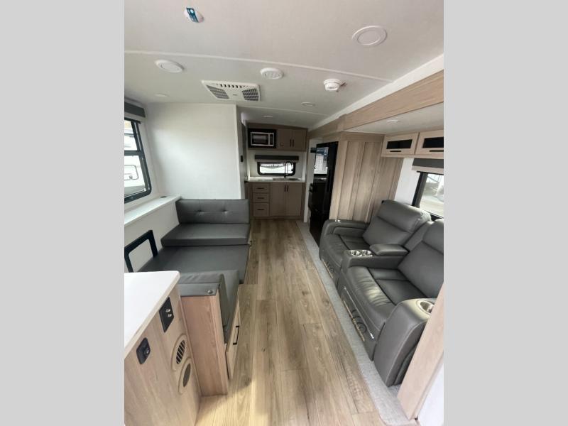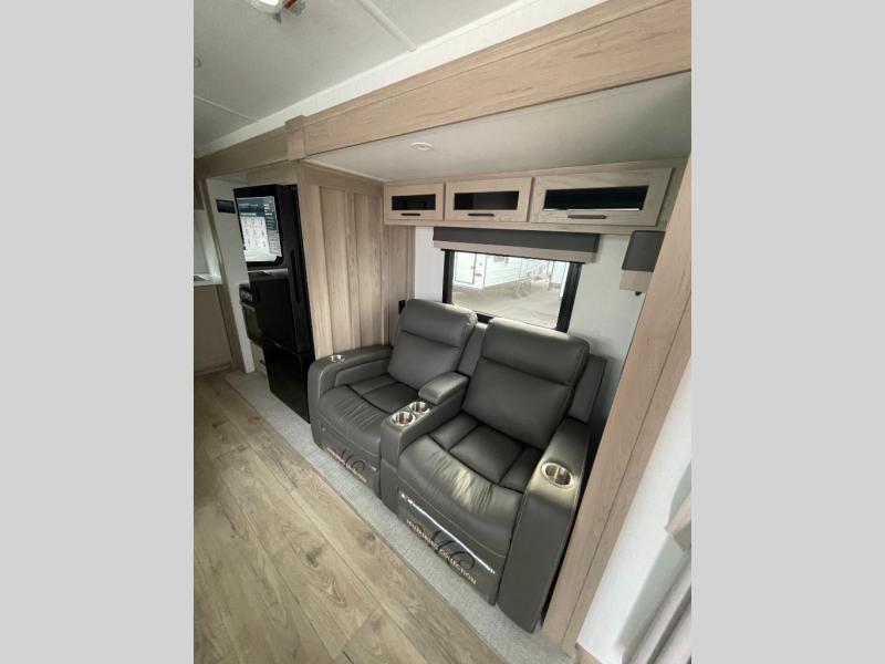 You'll be met with comfort at every turn in this spacious travel trailer. There is a large slide out which houses the theater seat, cooktop and refrigerator, plus a second slide out with a pantry/wardrobe for extra storage. You can sleep great each night on the front 60" x 74" queen bed, and there is flip-up storage underneath for extra blankets, boards games, and more. Once dinner has been made, you can dine at the booth dinette, or take your plate outdoors to relax under the 20' power awning. This unit also includes a full bath so you don't have to use the camp's facilities in the middle of the night!