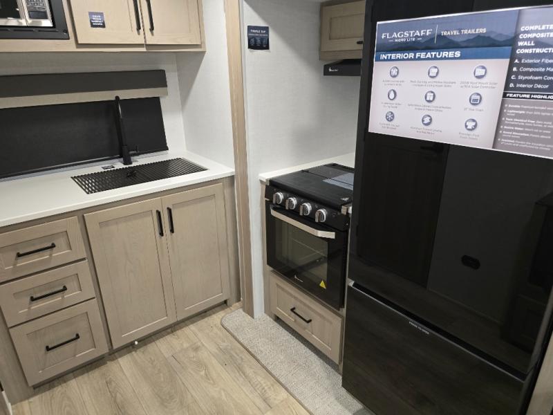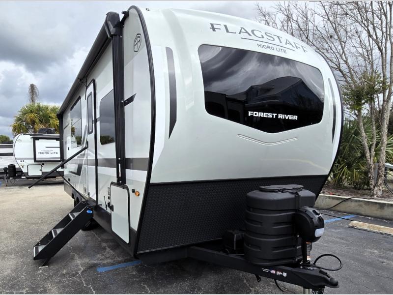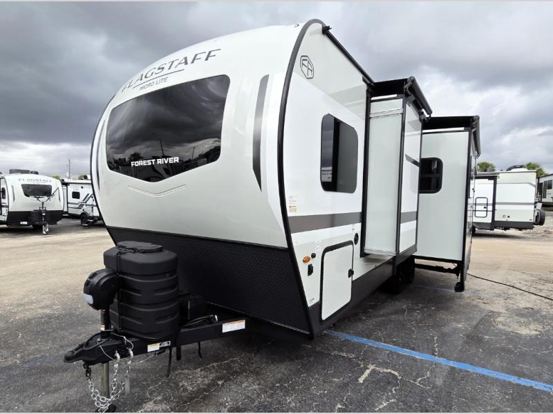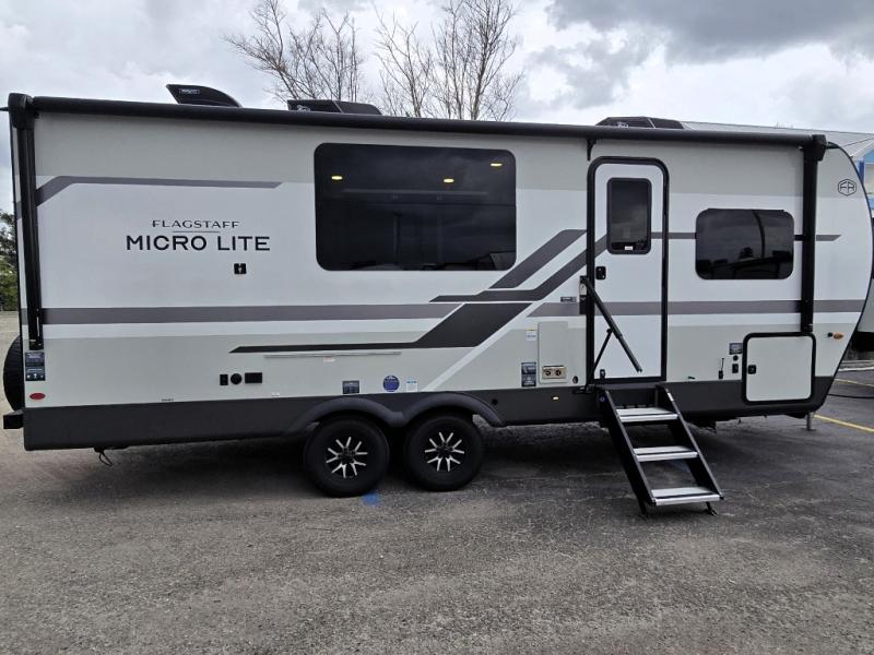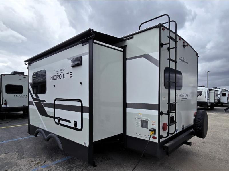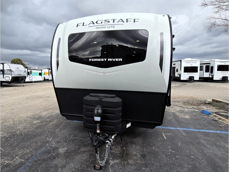 With any Flagstaff Micro Lite travel trailer by Forest River you will enjoy lightweight towing, durable construction, and added interior comforts to make each trip memorable! Each model features RoadTech tire pressure monitoring, Dexter Torflex axles, and nitrogen-filled Goodyear endurance tires for smooth towing from home to campground. The 6-sided aluminum framed construction provides a strong foundation so you can enjoy your RV for years to come, plus the radiant foil in the front cap, underbelly and slides help insulate your trailer. Additional exterior features include a 200W solar panel, back-up camera prep, frameless windows, and slam baggage doors. Each model includes the Great Expectations Package with roller shades, solid surface kitchen countertops, and hidden hinge cabinet doors. There is also an exterior hot/cold water port, outside speakers, a power tongue jack and stabilizer jacks, plus many more conveniences.