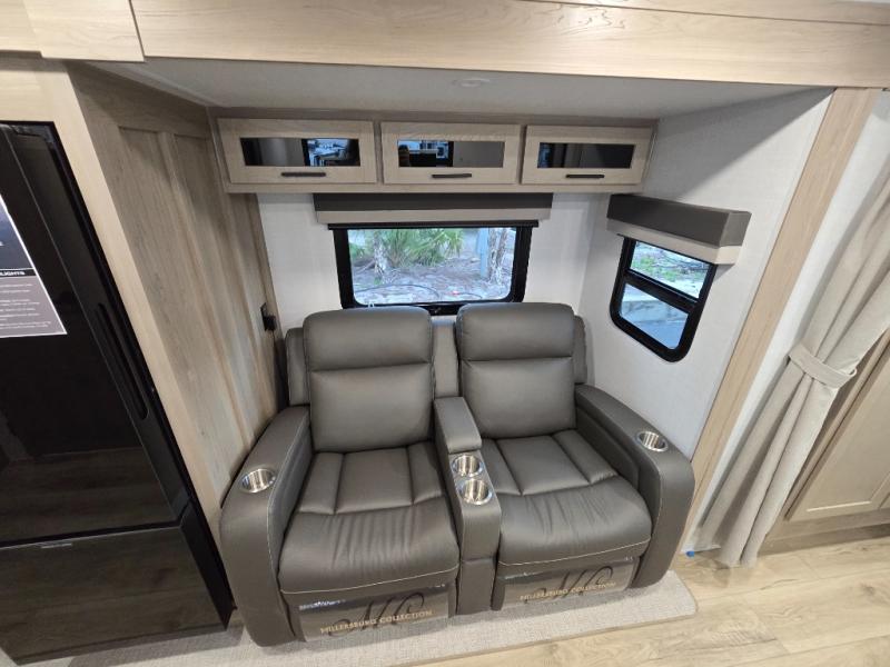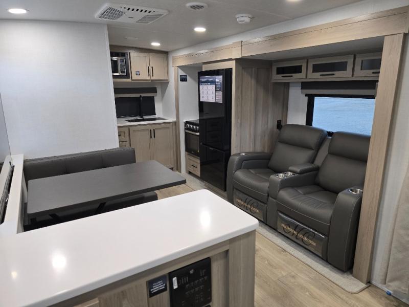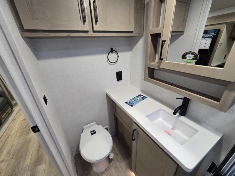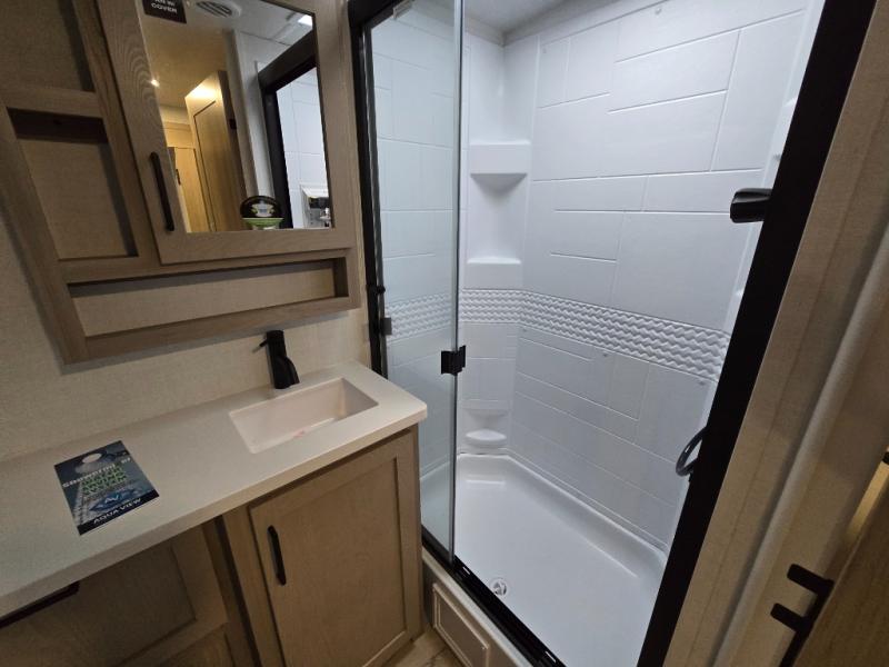 You'll be met with comfort at every turn in this spacious travel trailer. There is a large slide out which houses the theater seat, cooktop and refrigerator, plus a second slide out with a pantry/wardrobe for extra storage. You can sleep great each night on the front 60" x 74" queen bed, and there is flip-up storage underneath for extra blankets, boards games, and more. Once dinner has been made, you can dine at the booth dinette, or take your plate outdoors to relax under the 20' power awning. This unit also includes a full bath so you don't have to use the camp's facilities in the middle of the night!