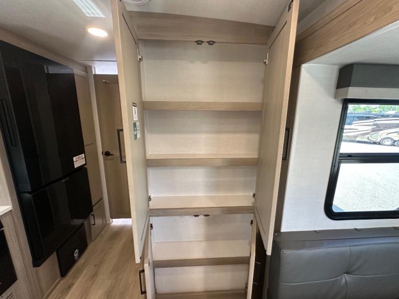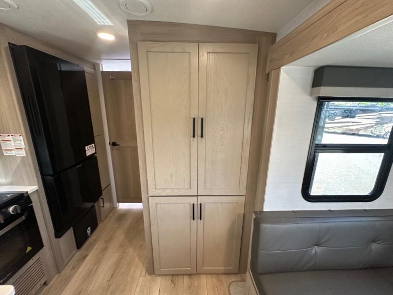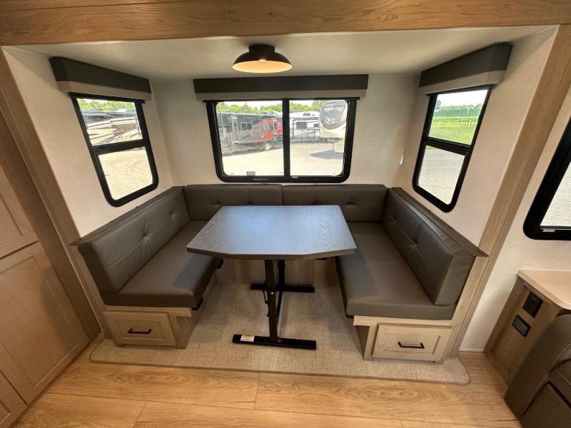 Camping in this double slide out travel trailer will make weekends at the campground comfy and hassle-free! Once you arrive, you can unload the pass-through storage, put out the 18' power awning, then make lunch on the three burner cooktop. Everyone can gather around the U-shaped dinette slide for meal times or game night, and there is a spacious pantry where you can store snacks! Within the bunkhouse you'll find a dream dinette and a flip-up bunk, plus a TV option if you want to add entertainment. And you're sure to appreciate the front 74" sofa with a Murphy bed, dual wardrobes, and a privacy curtain!