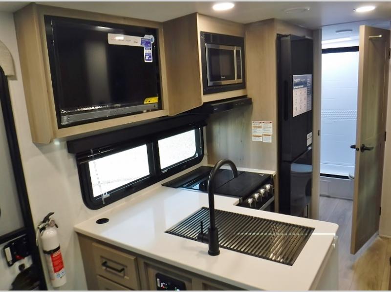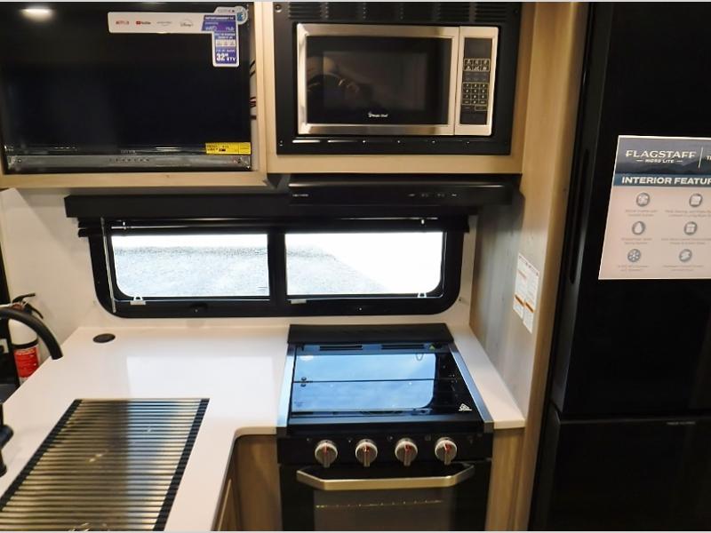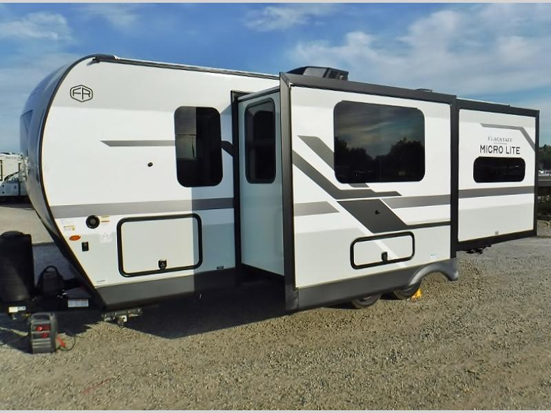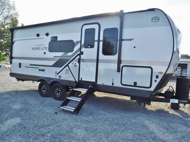 With any Flagstaff Micro Lite travel trailer by Forest River you will enjoy lightweight towing, durable construction, and added interior comforts to make each trip memorable! Each model features RoadTech tire pressure monitoring, Dexter Torflex axles, and nitrogen-filled Goodyear endurance tires for smooth towing from home to campground. The 6-sided aluminum framed construction provides a strong foundation so you can enjoy your RV for years to come, plus the radiant foil in the front cap, underbelly and slides help insulate your trailer. Additional exterior features include a 200W solar panel, back-up camera prep, frameless windows, and slam baggage doors. Each model includes the Great Expectations Package with roller shades, solid surface kitchen countertops, and hidden hinge cabinet doors. There is also an exterior hot/cold water port, outside speakers, a power tongue jack and stabilizer jacks, plus many more conveniences.