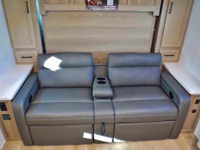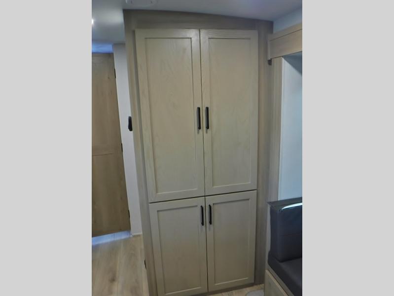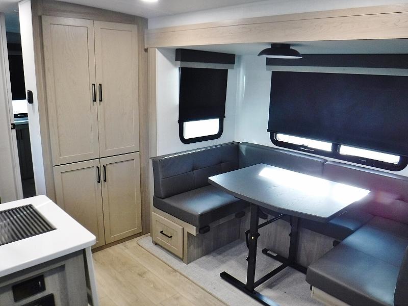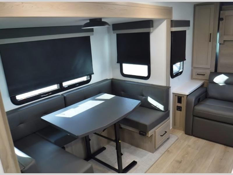Camping in this double slide out travel trailer will make weekends at the campground comfy and hassle-free! Once you arrive, you can unload the pass-through storage, put out the 18' power awning, then make lunch on the three burner cooktop. Everyone can gather around the U-shaped dinette slide for meal times or game night, and there is a spacious pantry where you can store snacks! Within the bunkhouse you'll find a dream dinette and a flip-up bunk, plus a TV option if you want to add entertainment. And you're sure to appreciate the front 74" sofa with a Murphy bed, dual wardrobes, and a privacy curtain!