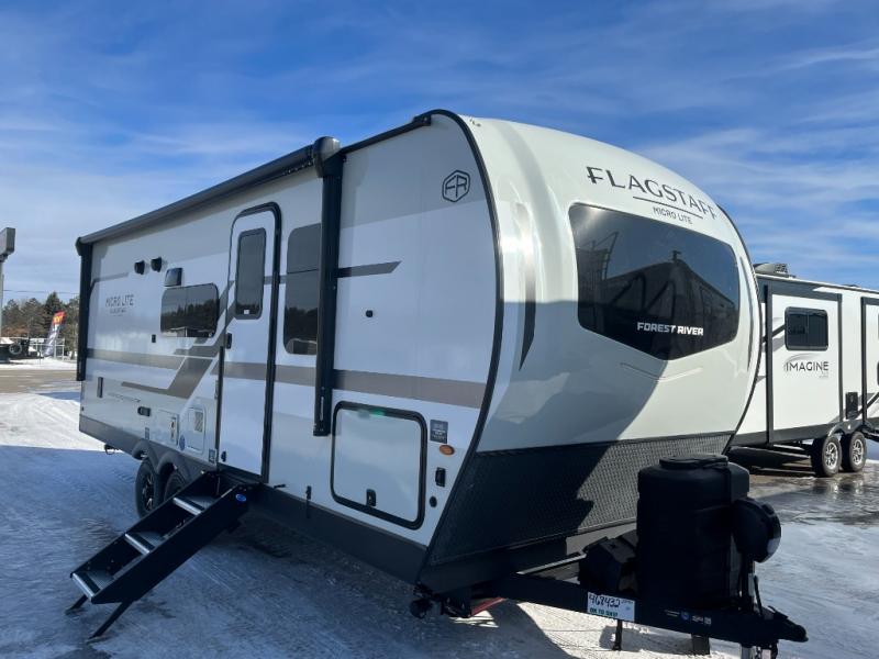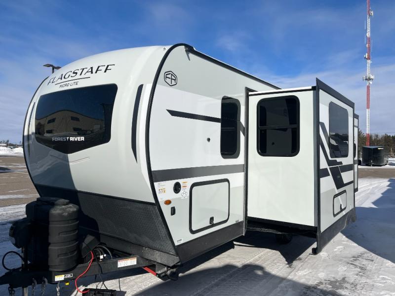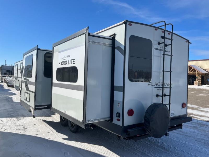 With any Flagstaff Micro Lite travel trailer by Forest River you will enjoy lightweight towing, durable construction, and added interior comforts to make each trip memorable! Each model features RoadTech tire pressure monitoring, Dexter Torflex axles, and nitrogen-filled Goodyear endurance tires for smooth towing from home to campground. The 6-sided aluminum framed construction provides a strong foundation so you can enjoy your RV for years to come, plus the radiant foil in the front cap, underbelly and slides help insulate your trailer. Additional exterior features include a 200W solar panel, back-up camera prep, frameless windows, and slam baggage doors. Each model includes the Great Expectations Package with roller shades, solid surface kitchen countertops, and hidden hinge cabinet doors. There is also an exterior hot/cold water port, outside speakers, a power tongue jack and stabilizer jacks, plus many more conveniences.