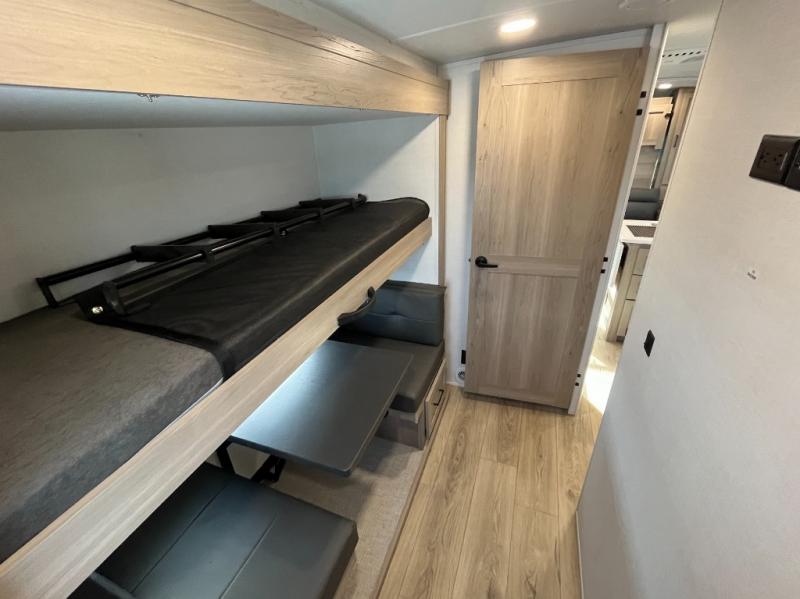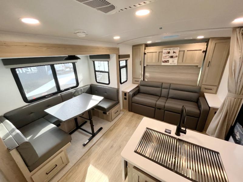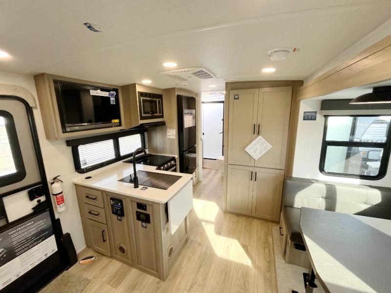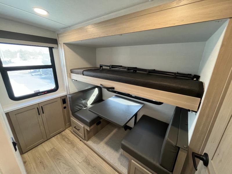 Camping in this double slide out travel trailer will make weekends at the campground comfy and hassle-free! Once you arrive, you can unload the pass-through storage, put out the 18' power awning, then make lunch on the three burner cooktop. Everyone can gather around the U-shaped dinette slide for meal times or game night, and there is a spacious pantry where you can store snacks! Within the bunkhouse you'll find a dream dinette and a flip-up bunk, plus a TV option if you want to add entertainment. And you're sure to appreciate the front 74" sofa with a Murphy bed, dual wardrobes, and a privacy curtain!