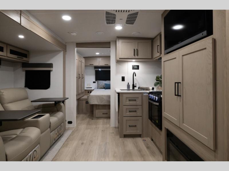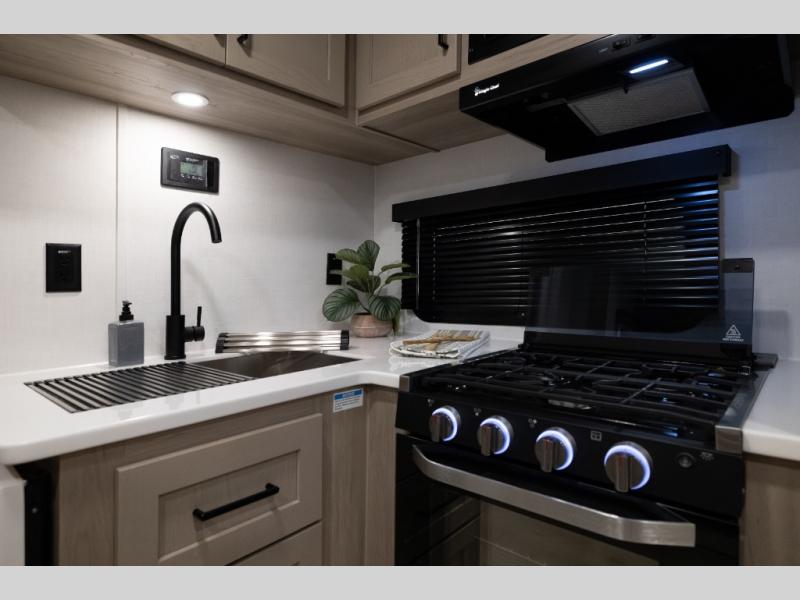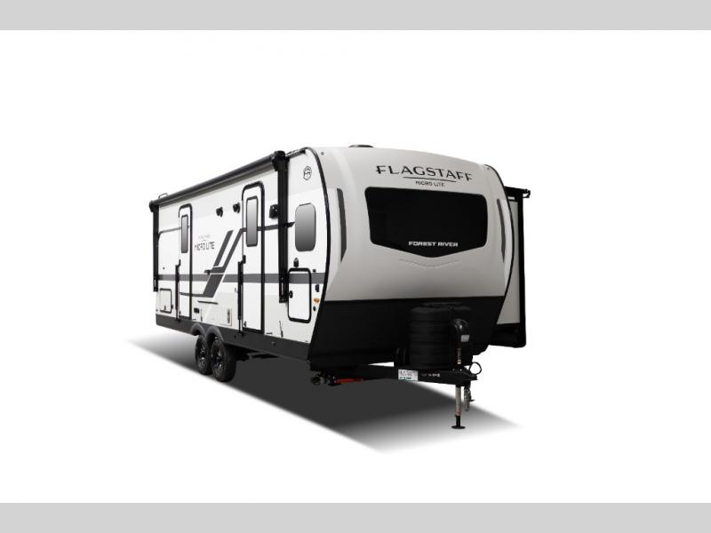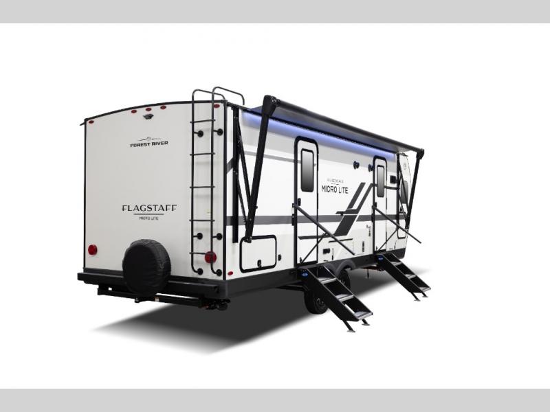 With any Flagstaff Micro Lite travel trailer by Forest River you will enjoy lightweight towing, durable construction, and added interior comforts to make each trip memorable! Each model features RoadTech tire pressure monitoring, Dexter Torflex axles, and nitrogen-filled Goodyear endurance tires for smooth towing from home to campground. The 6-sided aluminum framed construction provides a strong foundation so you can enjoy your RV for years to come, plus the radiant foil in the front cap, underbelly and slides help insulate your trailer. Additional exterior features include a 200W solar panel, back-up camera prep, frameless windows, and slam baggage doors. Each model includes the Great Expectations Package with roller shades, solid surface kitchen countertops, and hidden hinge cabinet doors. There is also an exterior hot/cold water port, outside speakers, a power tongue jack and stabilizer jacks, plus many more conveniences.