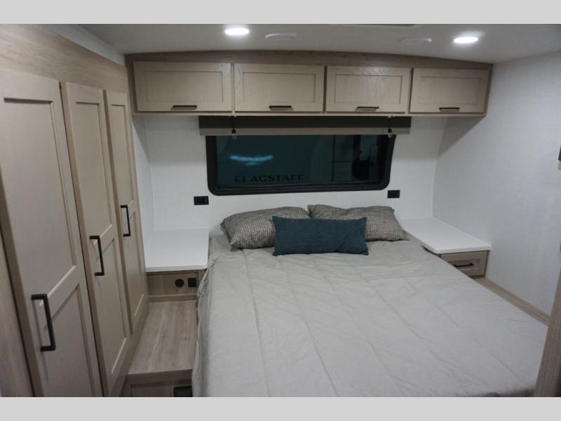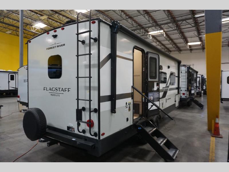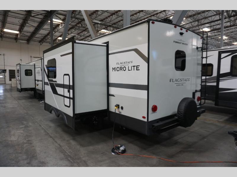 With any Flagstaff Micro Lite travel trailer by Forest River you will enjoy lightweight towing, durable construction, and added interior comforts to make each trip memorable! Each model features a torsion axle, Rubber-Ryde suspension, nitrogen filled, Goodyear Endurance tires, and easy lube axles with Nev-R-Adjust brakes for smooth towing from home to campground. The 6-sided aluminum framed construction provides a strong foundation so you can enjoy your RV for years to come, plus electronically controlled heated holding tanks and an enclosed underbelly will let you camp all year long. Head inside to find hybrid woven flooring in the slide outs, Sedona wood cabinetry, solid surface kitchen countertops, and many more amenities. These travel trailers also include exterior conveniences for hassle-free camping, like the power tongue jack, magnetic compartment door catches, Keyed Alike locks, and rear ladder to name a few!