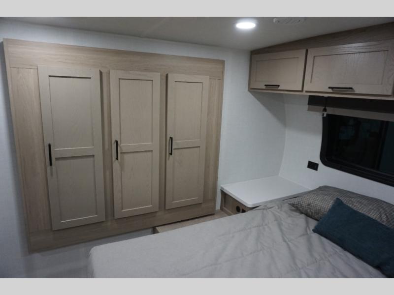 For the couple who enjoys a weekend camping trip, come choose this Flagstaff Micro Lite travel trailer. This unit features a slide that holds the theater seats with tables where you can dine each day, or you can choose the optional booth dinette or optional hide-a-bed sofa if you need more sleeping space. You'll love relaxing on these in the evening while you enjoy your entertainment center with an 32" 12V Smart entertainment TV. The private front bedroom includes an RV queen bed and a wardrobe slide. You'll love the cute kitchen with extra counter space for meal prep and a large closet/pantry to hold your favorite snacks.