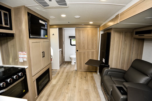 For the couple who enjoys a weekend camping trip, come choose this Flagstaff Micro Lite travel trailer. This unit features a slide that holds the theater seats with tables where you can dine each day, or you can choose the optional booth dinette or optional hide-a-bed sofa if you need more sleeping space. You'll love relaxing on these in the evening while you enjoy your entertainment center with a 12V Smart entertainment TV. The private front bedroom includes an RV queen bed and a wardrobe slide. You'll love the cute kitchen with extra counter space for meal prep and a large closet/pantry to hold your favorite snacks.