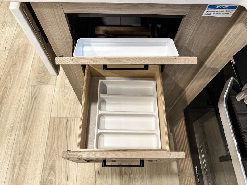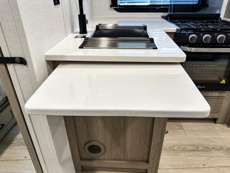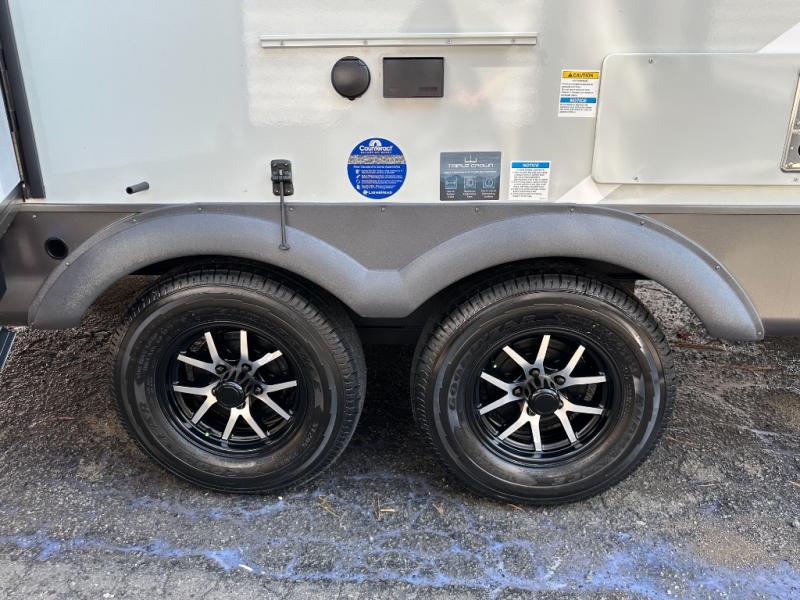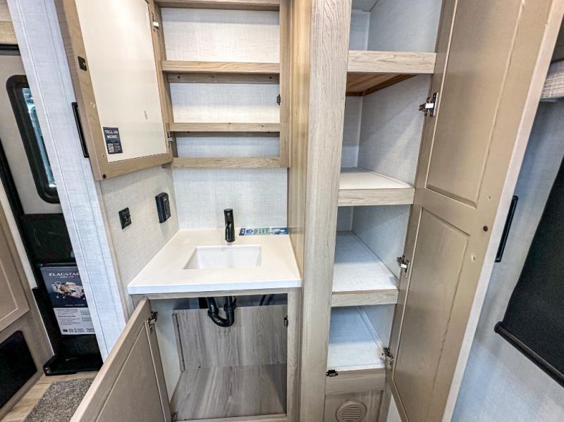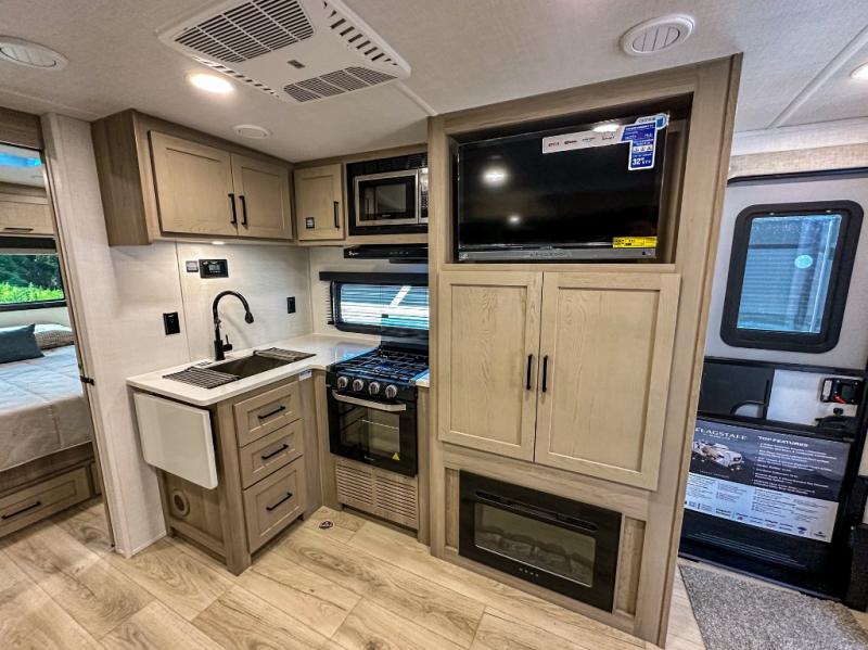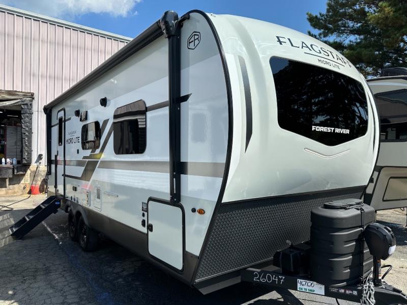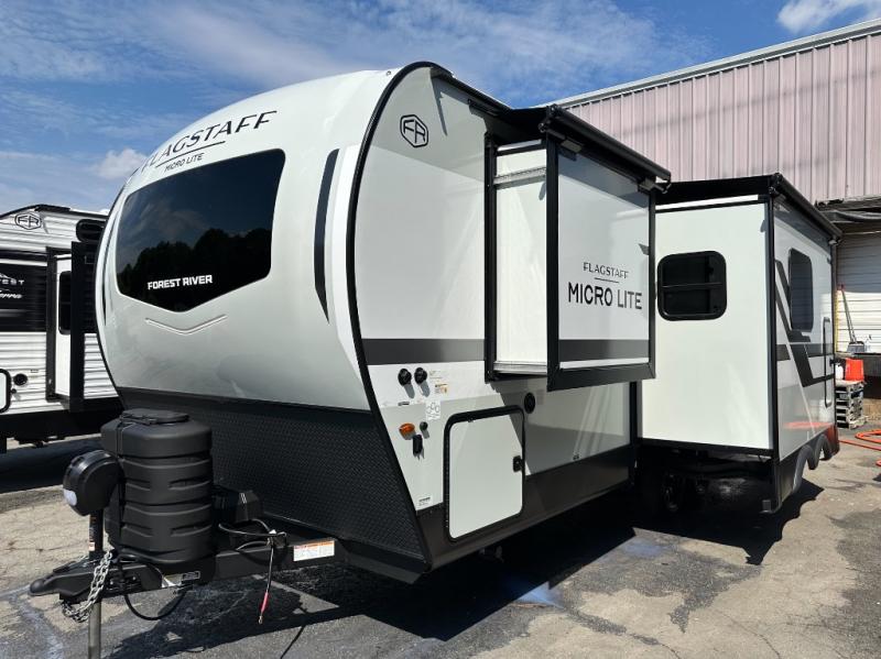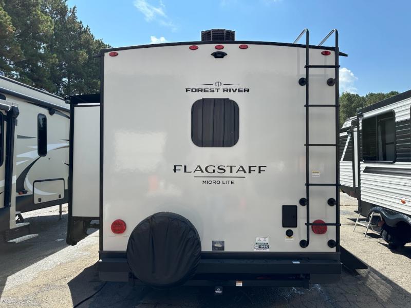 With any Flagstaff Micro Lite travel trailer by Forest River you will enjoy lightweight towing, durable construction, and added interior comforts to make each trip memorable! Each model features RoadTech tire pressure monitoring, Dexter Torflex axles, and nitrogen-filled Goodyear endurance tires for smooth towing from home to campground. The 6-sided aluminum framed construction provides a strong foundation so you can enjoy your RV for years to come, plus the radiant foil in the front cap, underbelly and slides help insulate your trailer. Additional exterior features include a 200W solar panel, back-up camera prep, frameless windows, and slam baggage doors. Each model includes the Great Expectations Package with roller shades, solid surface kitchen countertops, and hidden hinge cabinet doors. There is also an exterior hot/cold water port, outside speakers, a power tongue jack and stabilizer jacks, plus many more conveniences.