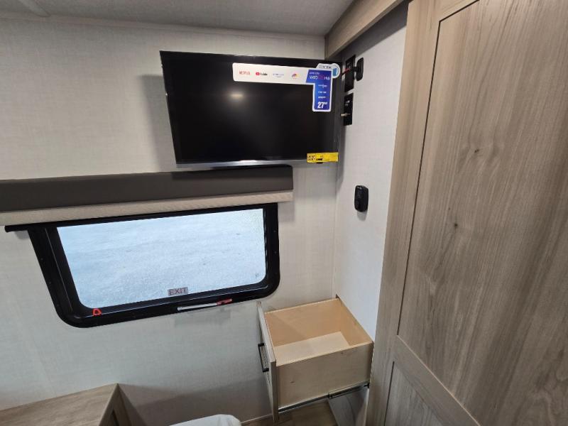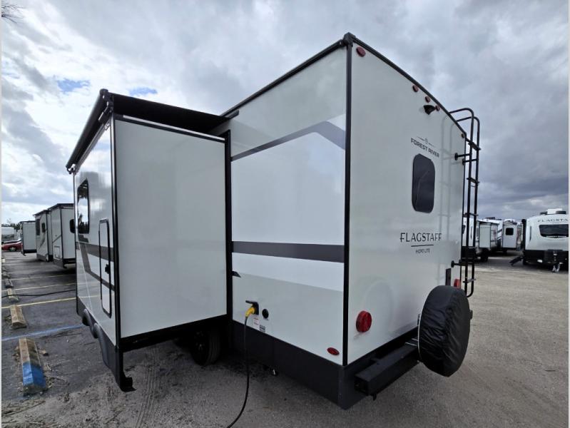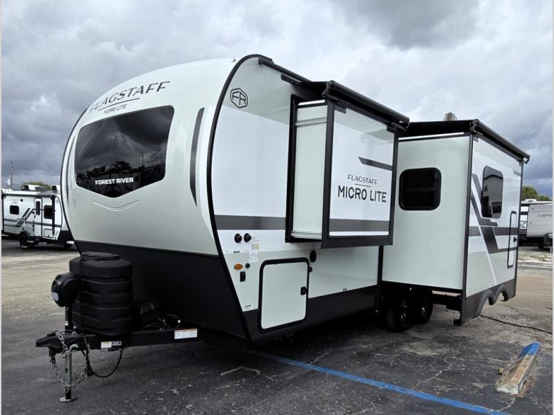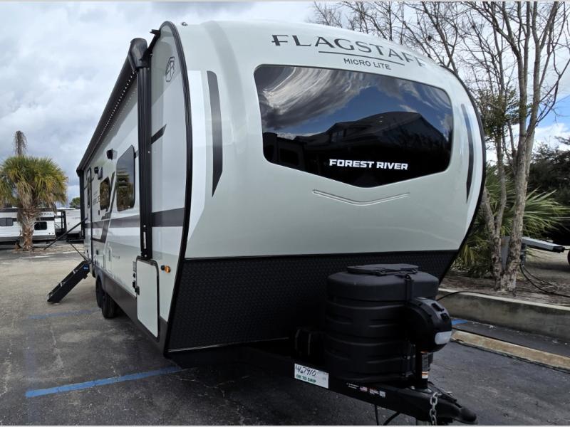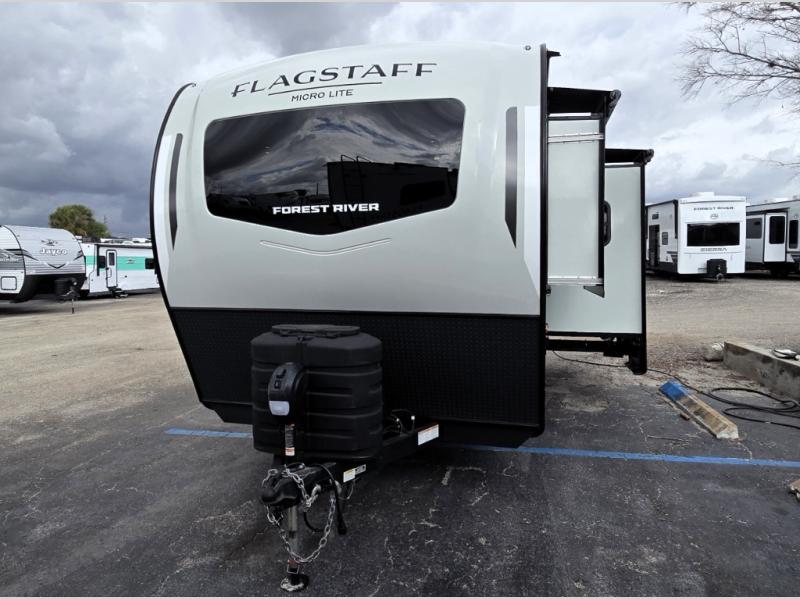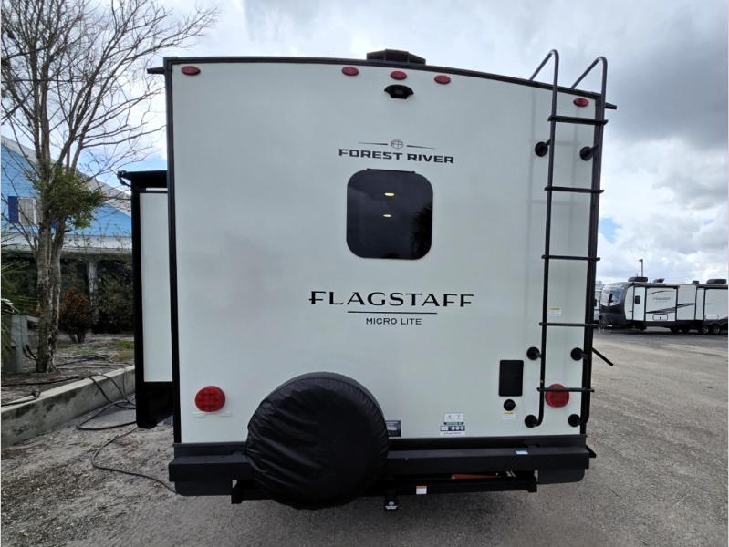 With any Flagstaff Micro Lite travel trailer by Forest River you will enjoy lightweight towing, durable construction, and added interior comforts to make each trip memorable! Each model features RoadTech tire pressure monitoring, Dexter Torflex axles, and nitrogen-filled Goodyear endurance tires for smooth towing from home to campground. The 6-sided aluminum framed construction provides a strong foundation so you can enjoy your RV for years to come, plus the radiant foil in the front cap, underbelly and slides help insulate your trailer. Additional exterior features include a 200W solar panel, back-up camera prep, frameless windows, and slam baggage doors. Each model includes the Great Expectations Package with roller shades, solid surface kitchen countertops, and hidden hinge cabinet doors. There is also an exterior hot/cold water port, outside speakers, a power tongue jack and stabilizer jacks, plus many more conveniences.