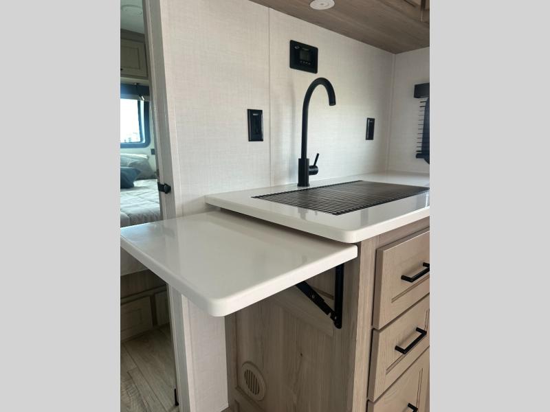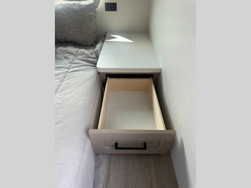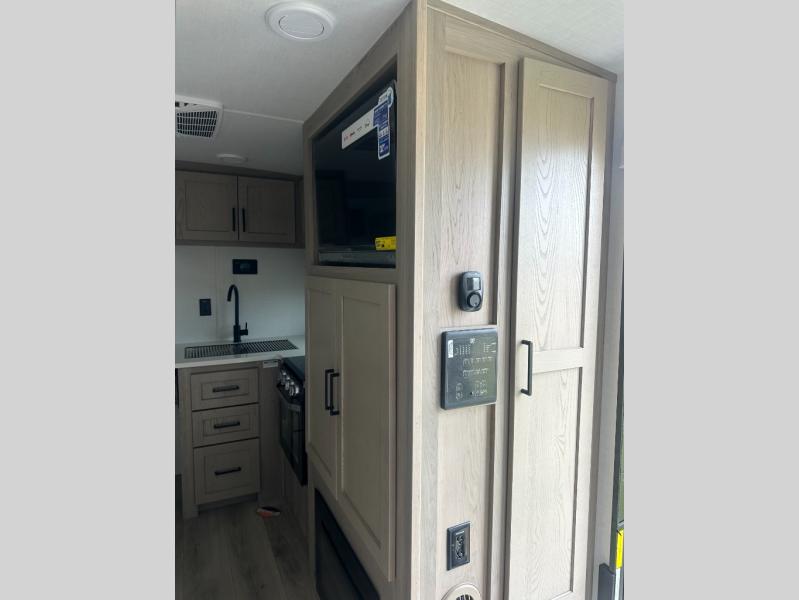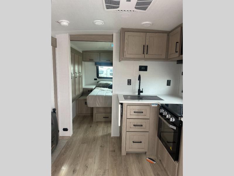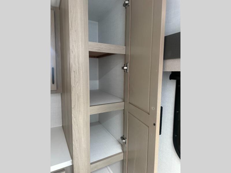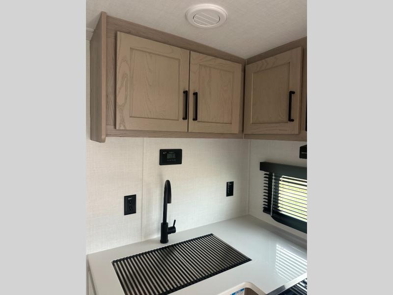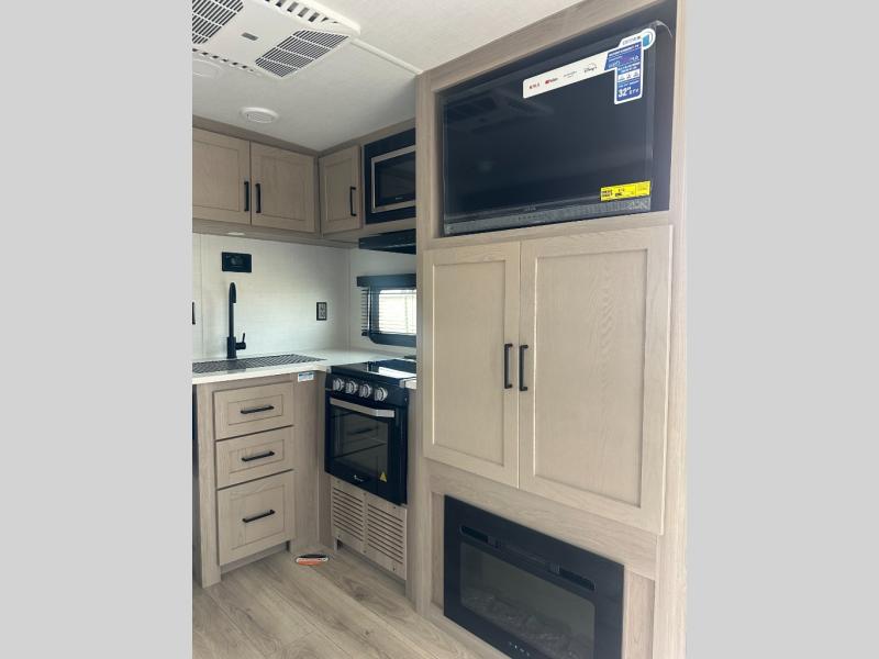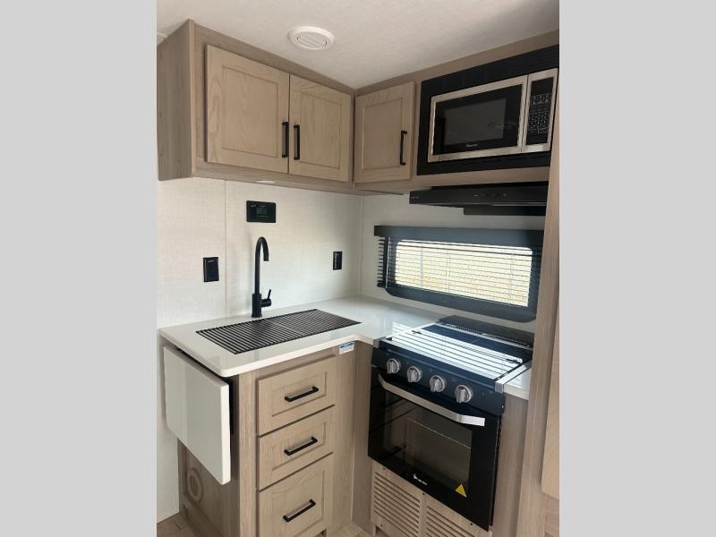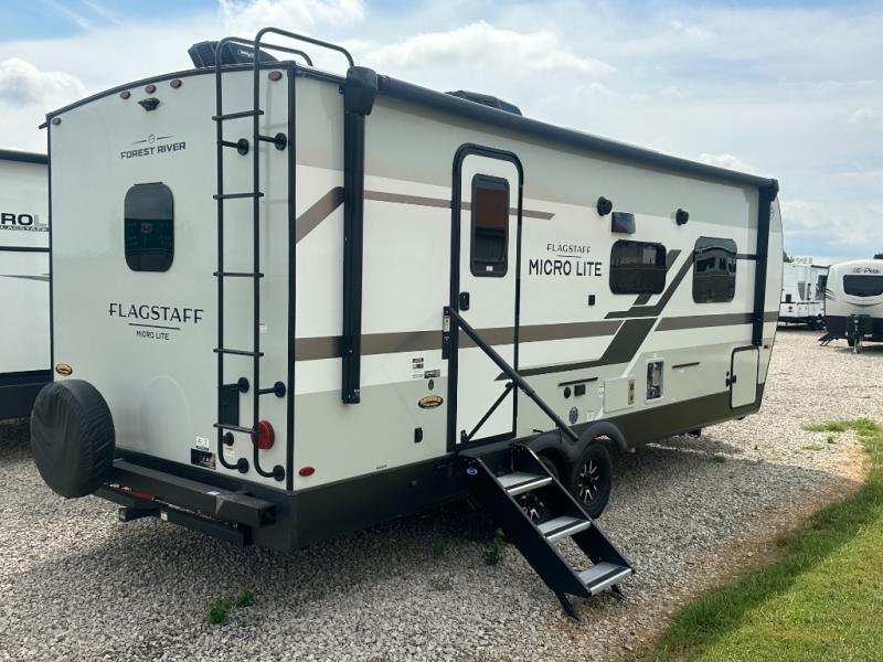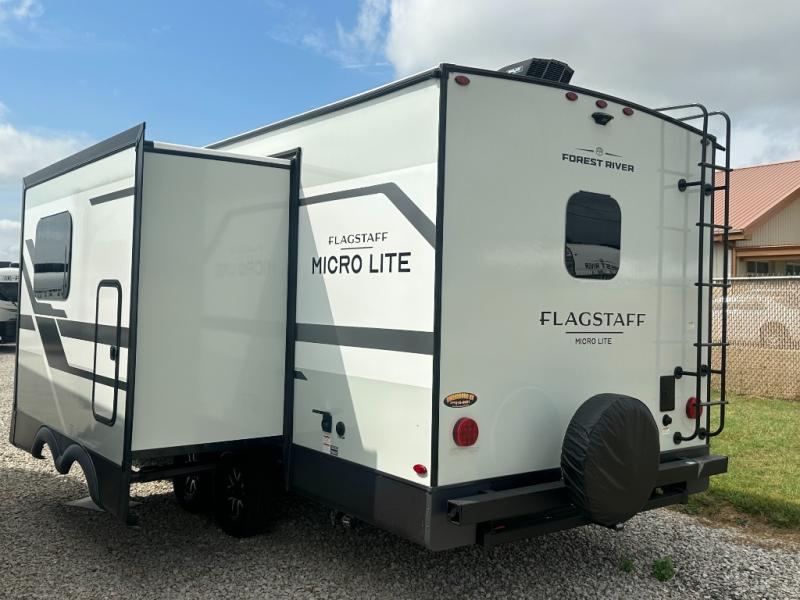 With any Flagstaff Micro Lite travel trailer by Forest River you will enjoy lightweight towing, durable construction, and added interior comforts to make each trip memorable! Each model features RoadTech tire pressure monitoring, Dexter Torflex axles, and nitrogen-filled Goodyear endurance tires for smooth towing from home to campground. The 6-sided aluminum framed construction provides a strong foundation so you can enjoy your RV for years to come, plus the radiant foil in the front cap, underbelly and slides help insulate your trailer. Additional exterior features include a 200W solar panel, back-up camera prep, frameless windows, and slam baggage doors. Each model includes the Great Expectations Package with roller shades, solid surface kitchen countertops, and hidden hinge cabinet doors. There is also an exterior hot/cold water port, outside speakers, a power tongue jack and stabilizer jacks, plus many more conveniences.