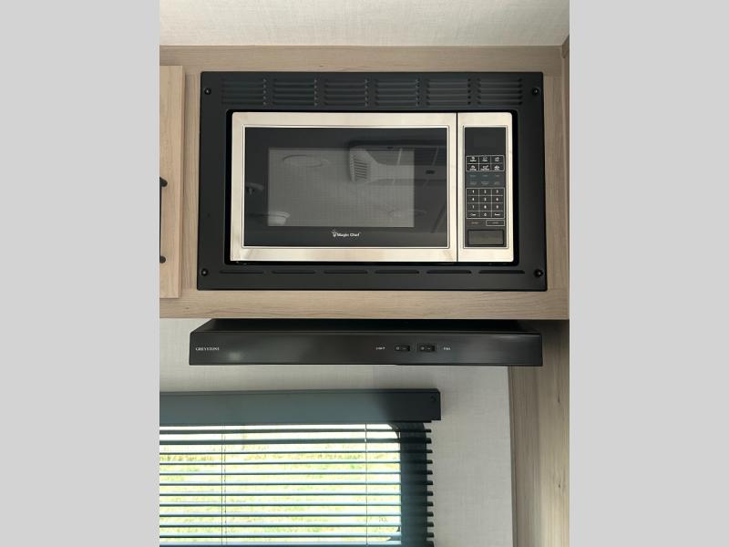 For the couple who enjoys a weekend camping trip, come choose this Flagstaff Micro Lite travel trailer. This unit features a slide that holds the theater seats with tables where you can dine each day, or you can choose the optional booth dinette or optional hide-a-bed sofa if you need more sleeping space. You'll love relaxing on these in the evening while you enjoy your entertainment center with a 12V Smart entertainment TV. The private front bedroom includes an RV queen bed and a wardrobe slide. You'll love the cute kitchen with extra counter space for meal prep and a large closet/pantry to hold your favorite snacks.