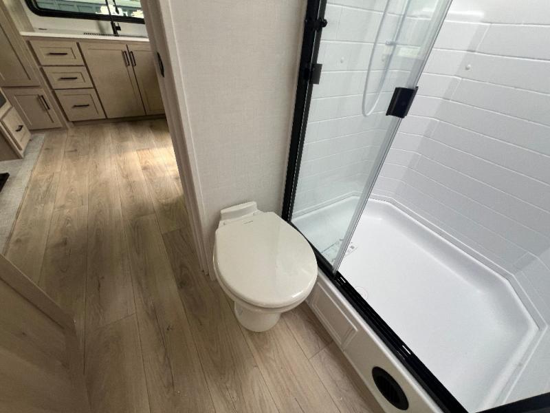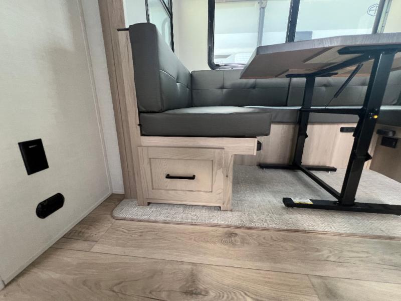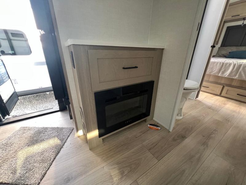 With dual entry doors and a front kitchen with generous counter space, this trailer is perfect for weekends at the campground! A U-shaped dinette slides provides more floor space inside, and it's in great view of the TV and fireplace. You'll find that the walk-thru bath is easily accessible, and the rear master bedroom will feel just like home with its RV queen bed and flip-up storage!