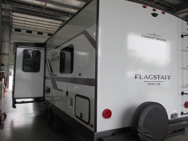 With any Flagstaff Micro Lite travel trailer by Forest River you will enjoy lightweight towing, durable construction, and added interior comforts to make each trip memorable! Each model features RoadTech tire pressure monitoring, Dexter Torflex axles, and nitrogen-filled Goodyear endurance tires for smooth towing from home to campground. The 6-sided aluminum framed construction provides a strong foundation so you can enjoy your RV for years to come, plus the radiant foil in the front cap, underbelly and slides help insulate your trailer. Additional exterior features include a 200W solar panel, back-up camera prep, frameless windows, and slam baggage doors. Each model includes the Great Expectations Package with roller shades, solid surface kitchen countertops, and hidden hinge cabinet doors. There is also an exterior hot/cold water port, outside speakers, a power tongue jack and stabilizer jacks, plus many more conveniences.
