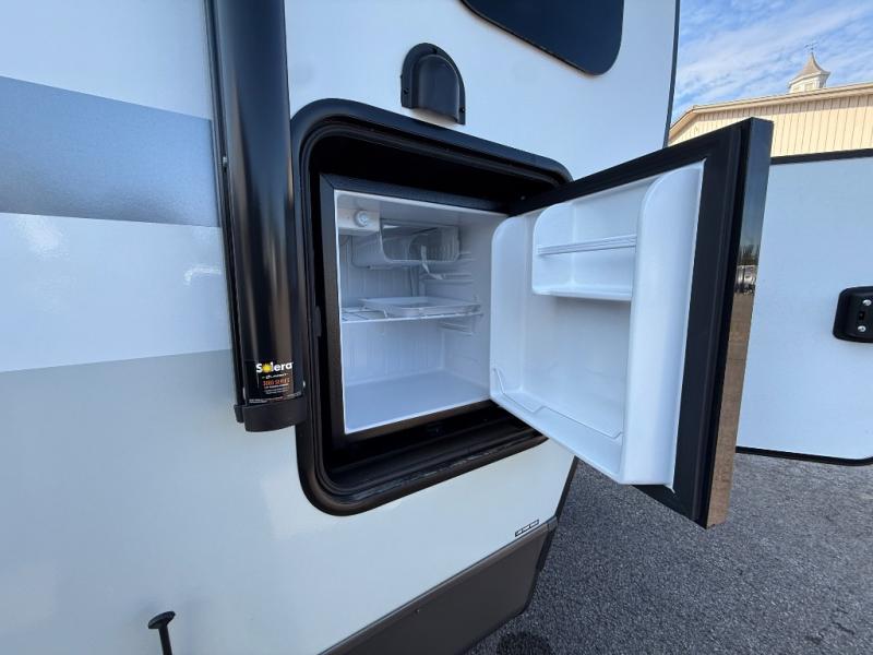 With dual entry doors and a front kitchen with generous counter space, this trailer is perfect for weekends at the campground! A U-shaped dinette slides provides more floor space inside, and it's in great view of the TV and fireplace. You'll find that the walk-thru bath is easily accessible, and the rear master bedroom will feel just like home with its RV queen bed and flip-up storage!