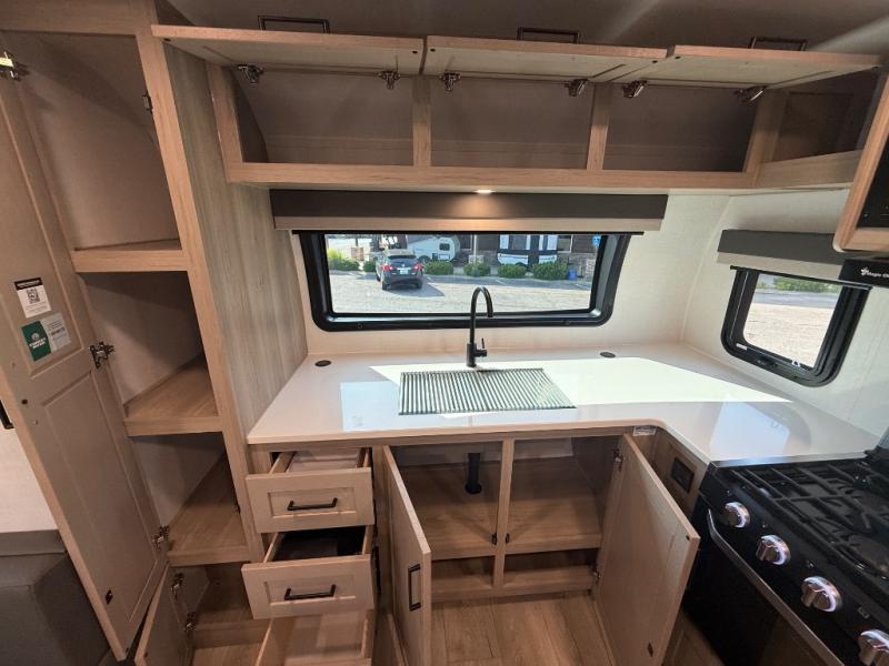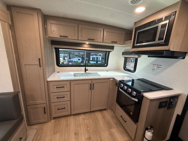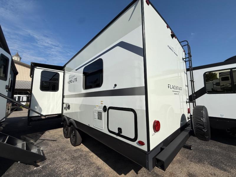 With any Flagstaff Micro Lite travel trailer by Forest River you will enjoy lightweight towing, durable construction, and added interior comforts to make each trip memorable! Each model features RoadTech tire pressure monitoring, Dexter Torflex axles, and nitrogen-filled Goodyear endurance tires for smooth towing from home to campground. The 6-sided aluminum framed construction provides a strong foundation so you can enjoy your RV for years to come, plus the radiant foil in the front cap, underbelly and slides help insulate your trailer. Additional exterior features include a 200W solar panel, back-up camera prep, frameless windows, and slam baggage doors. Each model includes the Great Expectations Package with roller shades, solid surface kitchen countertops, and hidden hinge cabinet doors. There is also an exterior hot/cold water port, outside speakers, a power tongue jack and stabilizer jacks, plus many more conveniences.