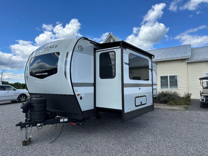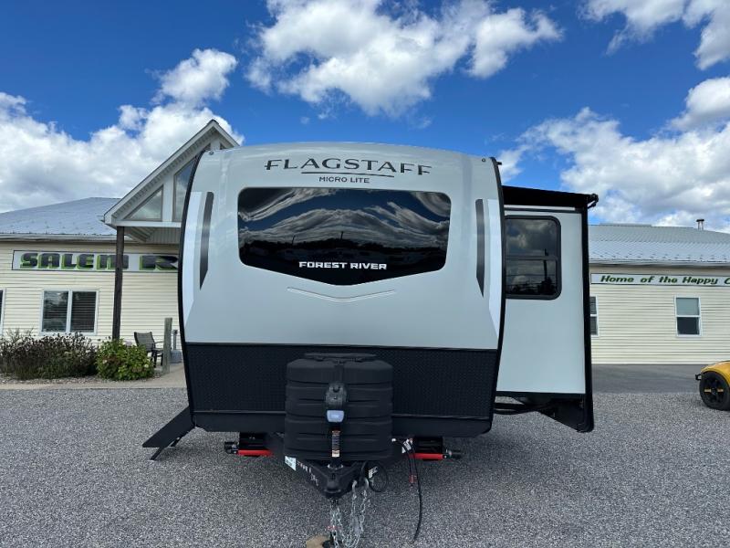 With any Flagstaff Micro Lite travel trailer by Forest River you will enjoy lightweight towing, durable construction, and added interior comforts to make each trip memorable! Each model features RoadTech tire pressure monitoring, Dexter Torflex axles, and nitrogen-filled Goodyear endurance tires for smooth towing from home to campground. The 6-sided aluminum framed construction provides a strong foundation so you can enjoy your RV for years to come, plus the radiant foil in the front cap, underbelly and slides help insulate your trailer. Additional exterior features include a 200W solar panel, back-up camera prep, frameless windows, and slam baggage doors. Each model includes the Great Expectations Package with roller shades, solid surface kitchen countertops, and hidden hinge cabinet doors. There is also an exterior hot/cold water port, outside speakers, a power tongue jack and stabilizer jacks, plus many more conveniences.