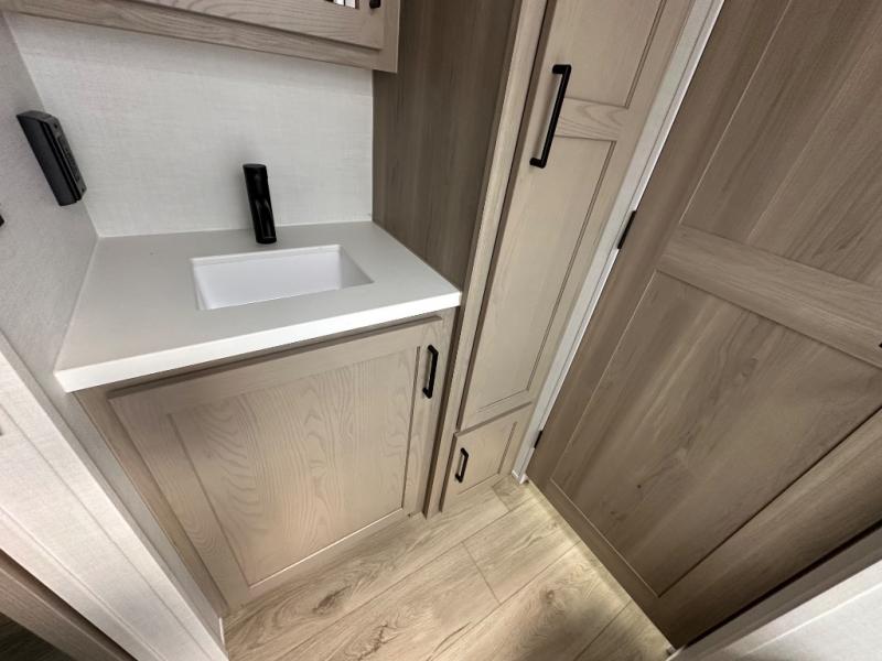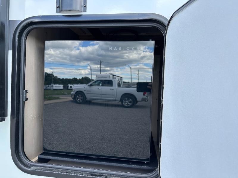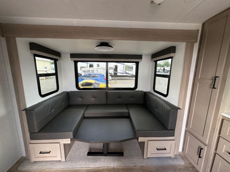 With dual entry doors and a front kitchen with generous counter space, this trailer is perfect for weekends at the campground! A U-shaped dinette slides provides more floor space inside, and it's in great view of the TV and fireplace. You'll find that the walk-thru bath is easily accessible, and the rear master bedroom will feel just like home with its RV queen bed and flip-up storage!
