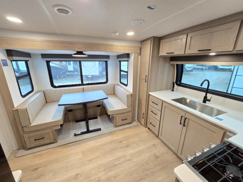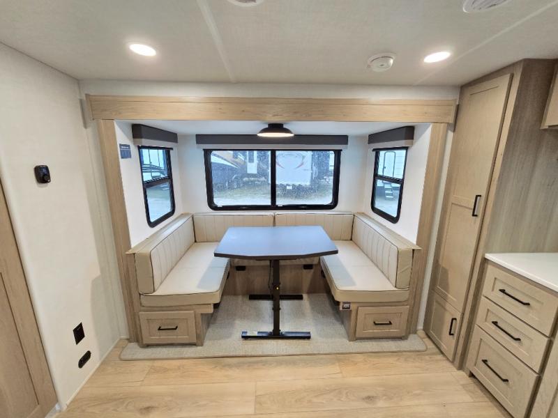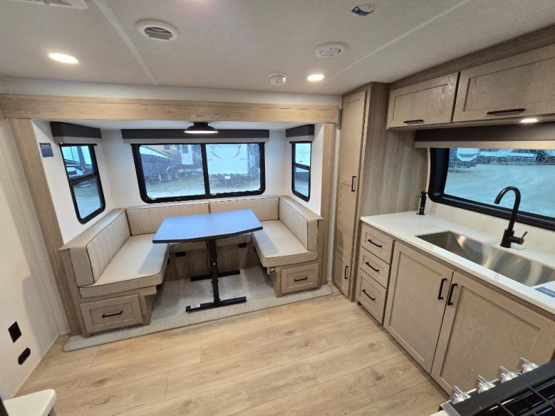 With dual entry doors and a front kitchen with generous counter space, this trailer is perfect for weekends at the campground! A U-shaped dinette slides provides more floor space inside, and it's in great view of the TV and fireplace. You'll find that the walk-thru bath is easily accessible, and the rear master bedroom will feel just like home with its RV queen bed and flip-up storage!