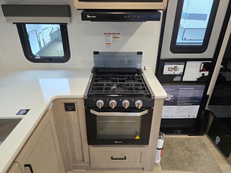 With any Flagstaff Micro Lite travel trailer by Forest River you will enjoy lightweight towing, durable construction, and added interior comforts to make each trip memorable! Each model features RoadTech tire pressure monitoring, Dexter Torflex axles, and nitrogen-filled Goodyear endurance tires for smooth towing from home to campground. The 6-sided aluminum framed construction provides a strong foundation so you can enjoy your RV for years to come, plus the radiant foil in the front cap, underbelly and slides help insulate your trailer. Additional exterior features include a 200W solar panel, back-up camera prep, frameless windows, and slam baggage doors. Each model includes the Great Expectations Package with roller shades, solid surface kitchen countertops, and hidden hinge cabinet doors. There is also an exterior hot/cold water port, outside speakers, a power tongue jack and stabilizer jacks, plus many more conveniences.