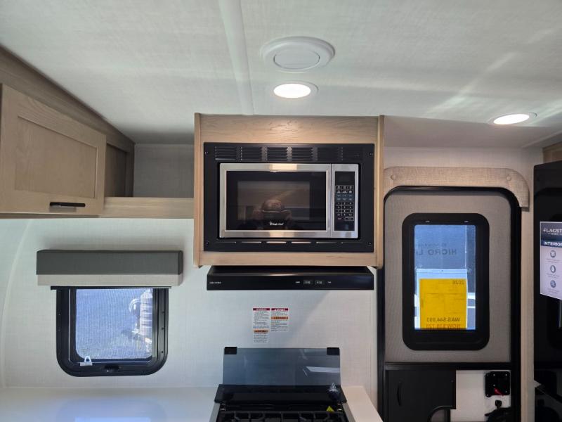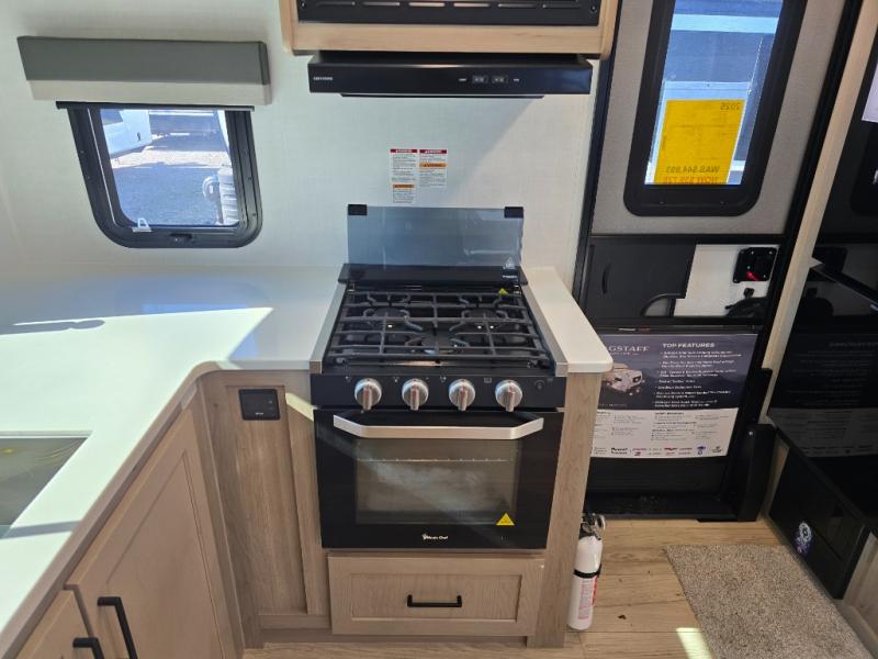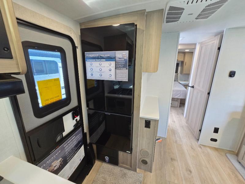 With any Flagstaff Micro Lite travel trailer by Forest River you will enjoy lightweight towing, durable construction, and added interior comforts to make each trip memorable! Each model features RoadTech tire pressure monitoring, Dexter Torflex axles, and nitrogen-filled Goodyear endurance tires for smooth towing from home to campground. The 6-sided aluminum framed construction provides a strong foundation so you can enjoy your RV for years to come, plus the radiant foil in the front cap, underbelly and slides help insulate your trailer. Additional exterior features include a 200W solar panel, back-up camera prep, frameless windows, and slam baggage doors. Each model includes the Great Expectations Package with roller shades, solid surface kitchen countertops, and hidden hinge cabinet doors. There is also an exterior hot/cold water port, outside speakers, a power tongue jack and stabilizer jacks, plus many more conveniences.